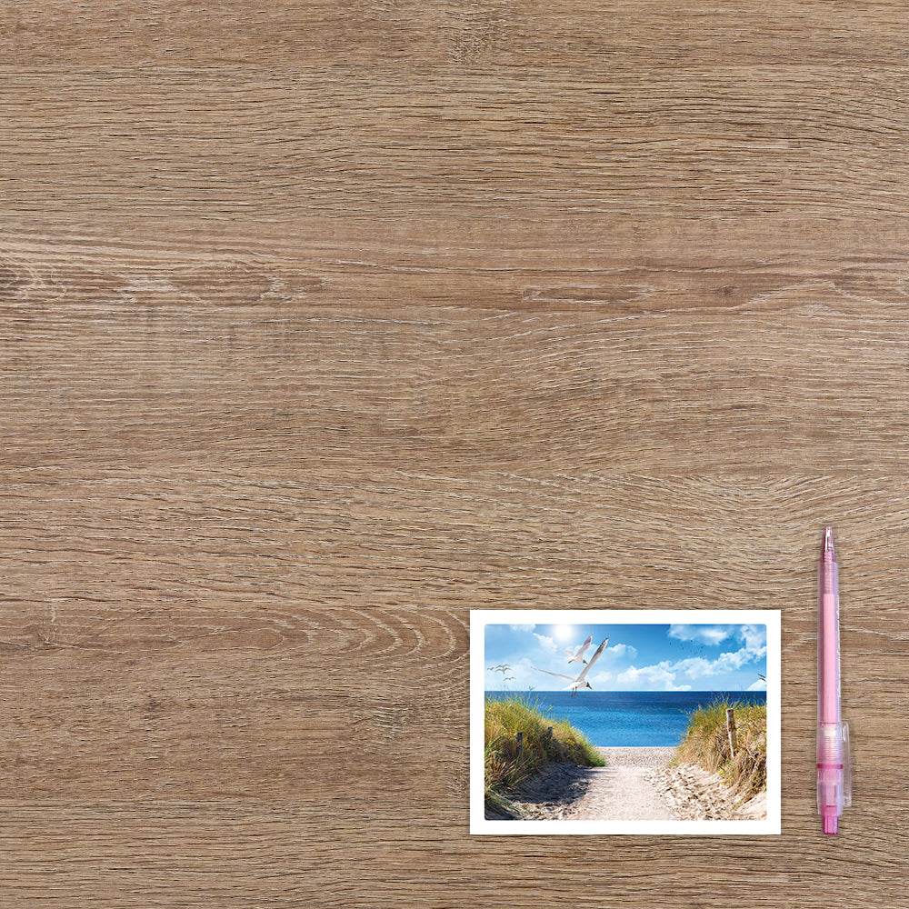 De wenskaart heeft een afmeting van x en een liggende vorm. Op deze wenskaart staan duinen die uitkijken op het strand en de zee. De binnenzijde van de wenskaart is blanco wat voldoende ruimte geeft om een persoonlijke boodschap te schrijven .
