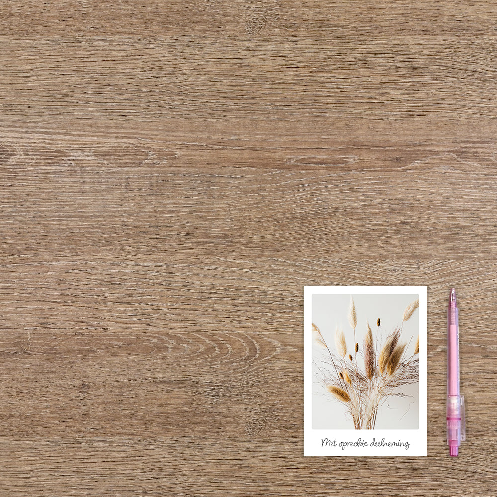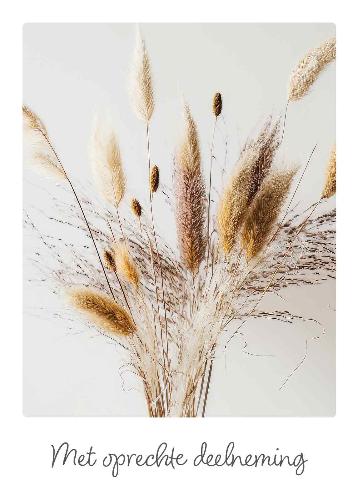 De wenskaart heeft een afmeting van x en een staande vorm. Op deze wenskaart staat een boeket van bruine en beige droogbloemen met daaronder de tekst: "Met oprechte deelneming". De binnenzijde van de wenskaart is blanco wat voldoende ruimte geeft om een persoonlijke boodschap te schrijven .