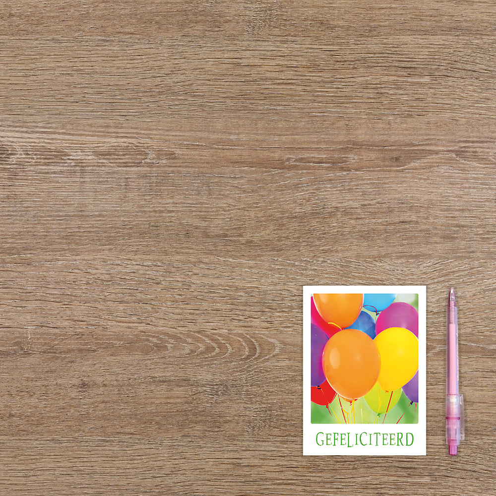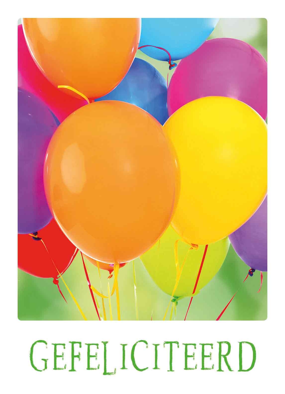 De wenskaart heeft een afmeting van x en een staande vorm. Op deze wenskaart staan ballonnen in de kleuren oranje, geel, roze en blauw. Daaronder staat de tekst: "Gefeliciteerd". De binnenzijde van de wenskaart is blanco wat voldoende ruimte geeft om een persoonlijke boodschap te schrijven .