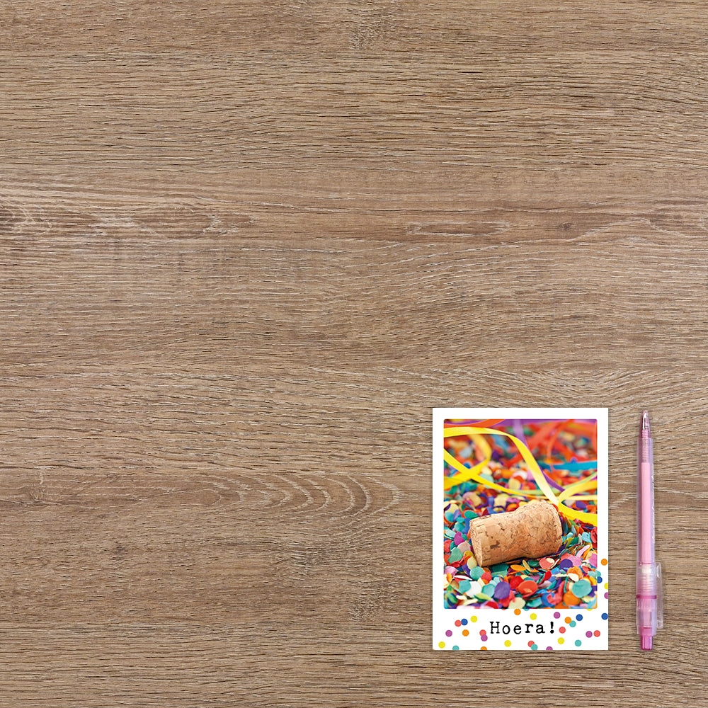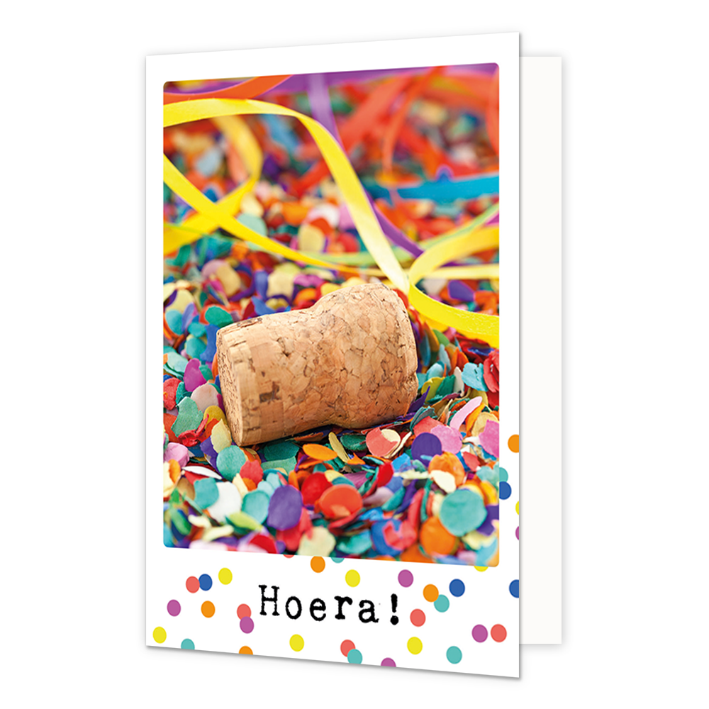 De wenskaart heeft een afmeting van x en een staande vorm. Op deze wenskaart staat een kurk die op confetti ligt met daaronder de tekst: "Hoera!". De binnenzijde van de wenskaart is blanco wat voldoende ruimte geeft om een persoonlijke boodschap te schrijven .