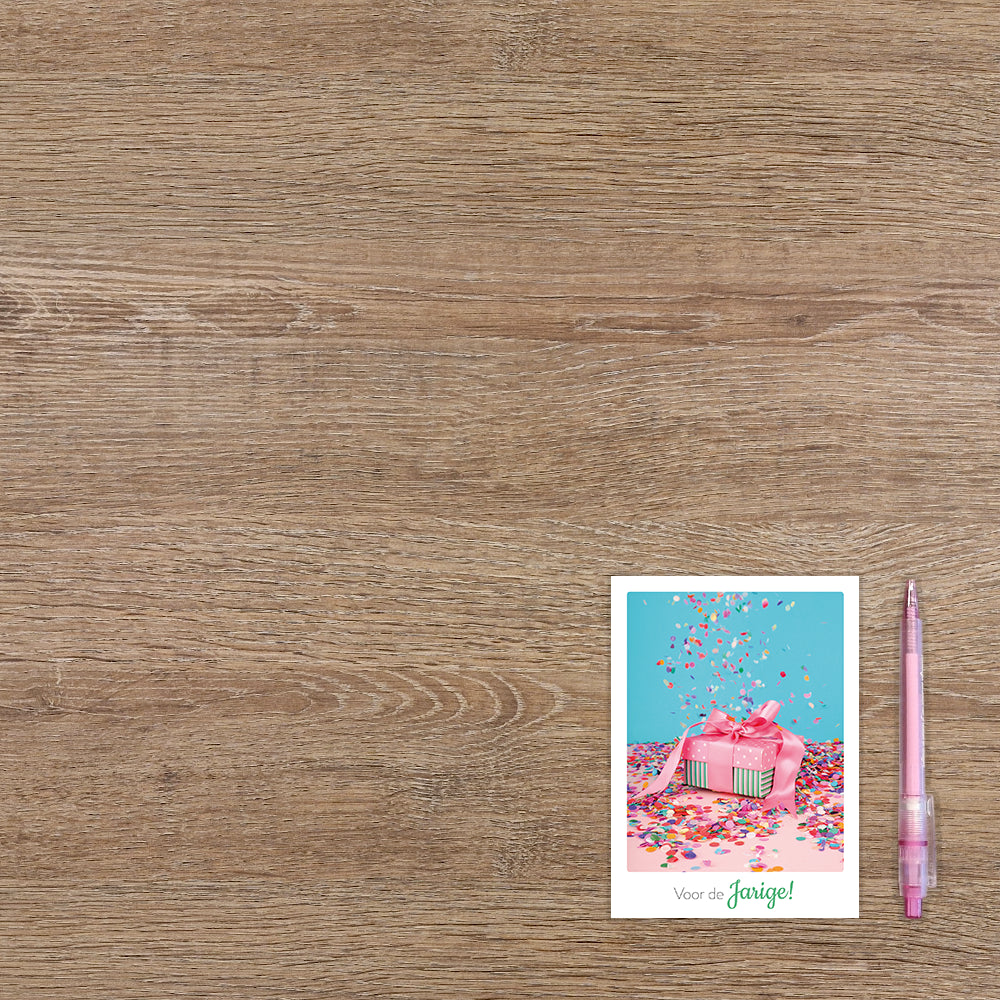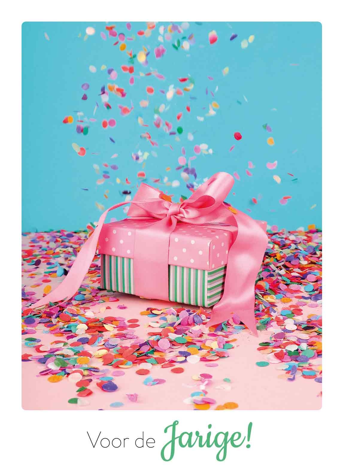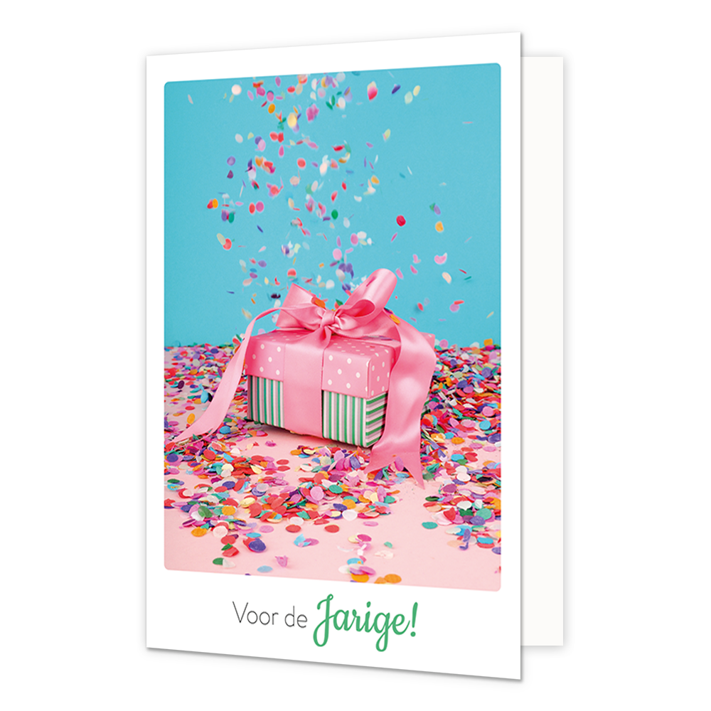 De wenskaart heeft een afmeting van x en een staande vorm. Op deze wenskaart staat een cadeautje met confetti en daaronder de tekst: "Voor de jarige". De binnenzijde van de wenskaart is blanco wat voldoende ruimte geeft om een persoonlijke boodschap te schrijven .