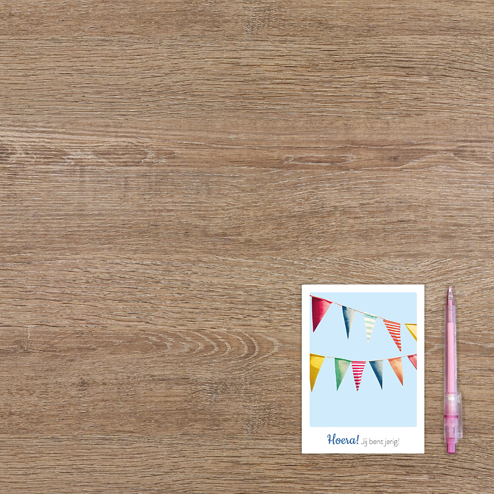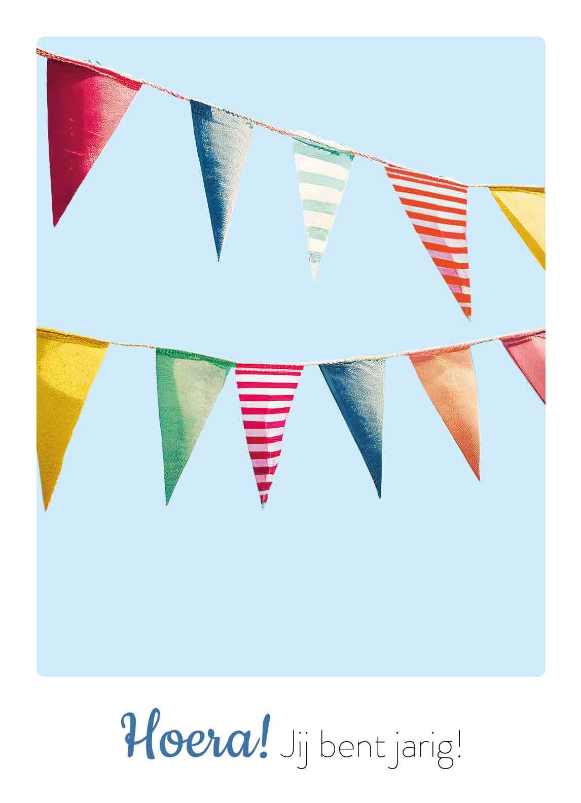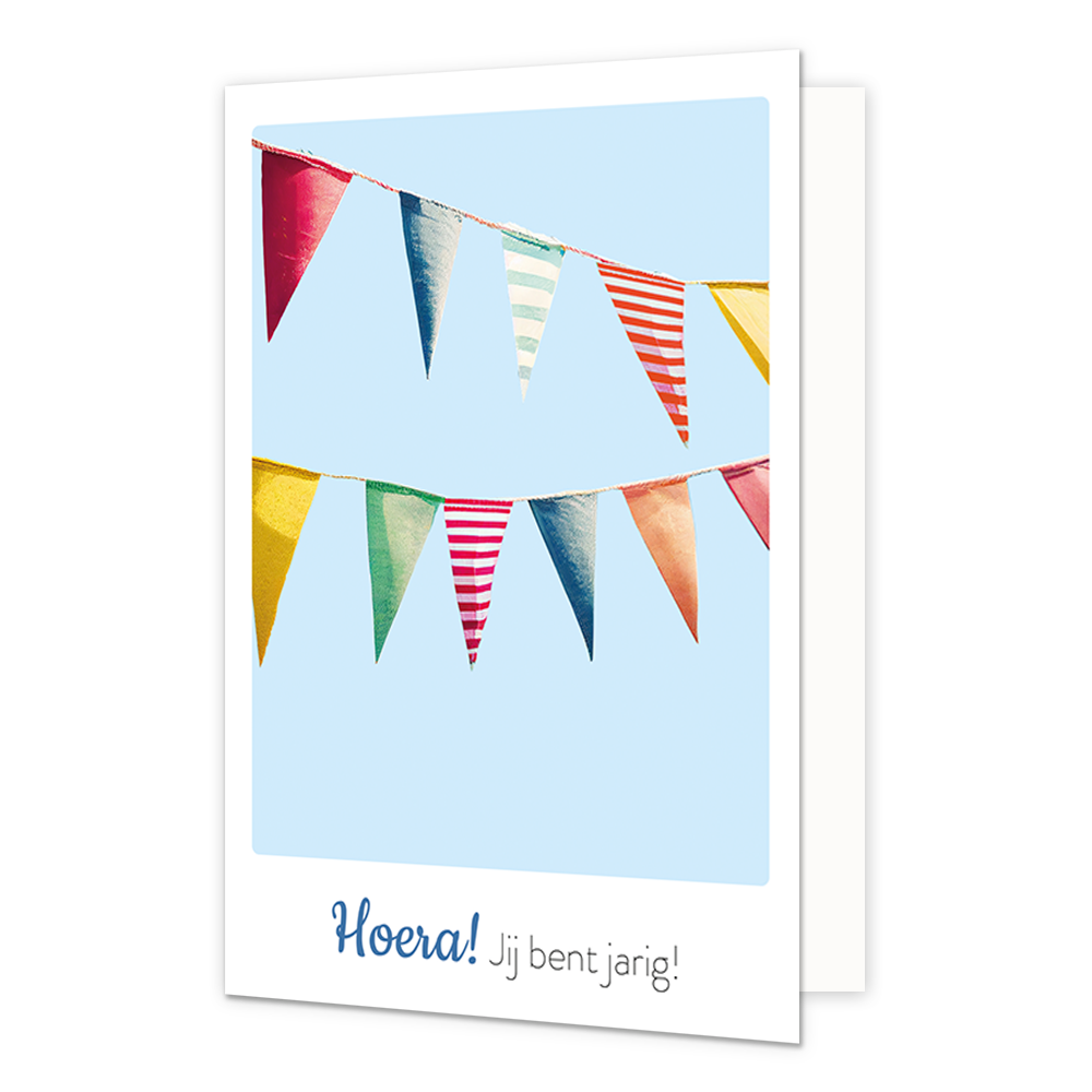 De wenskaart heeft een afmeting van x en een staande vorm. Op deze wenskaart staan slingers met daaronder de tekst: "Hoera! jij bent jarig!". De binnenzijde van de wenskaart is blanco wat voldoende ruimte geeft om een persoonlijke boodschap te schrijven .
