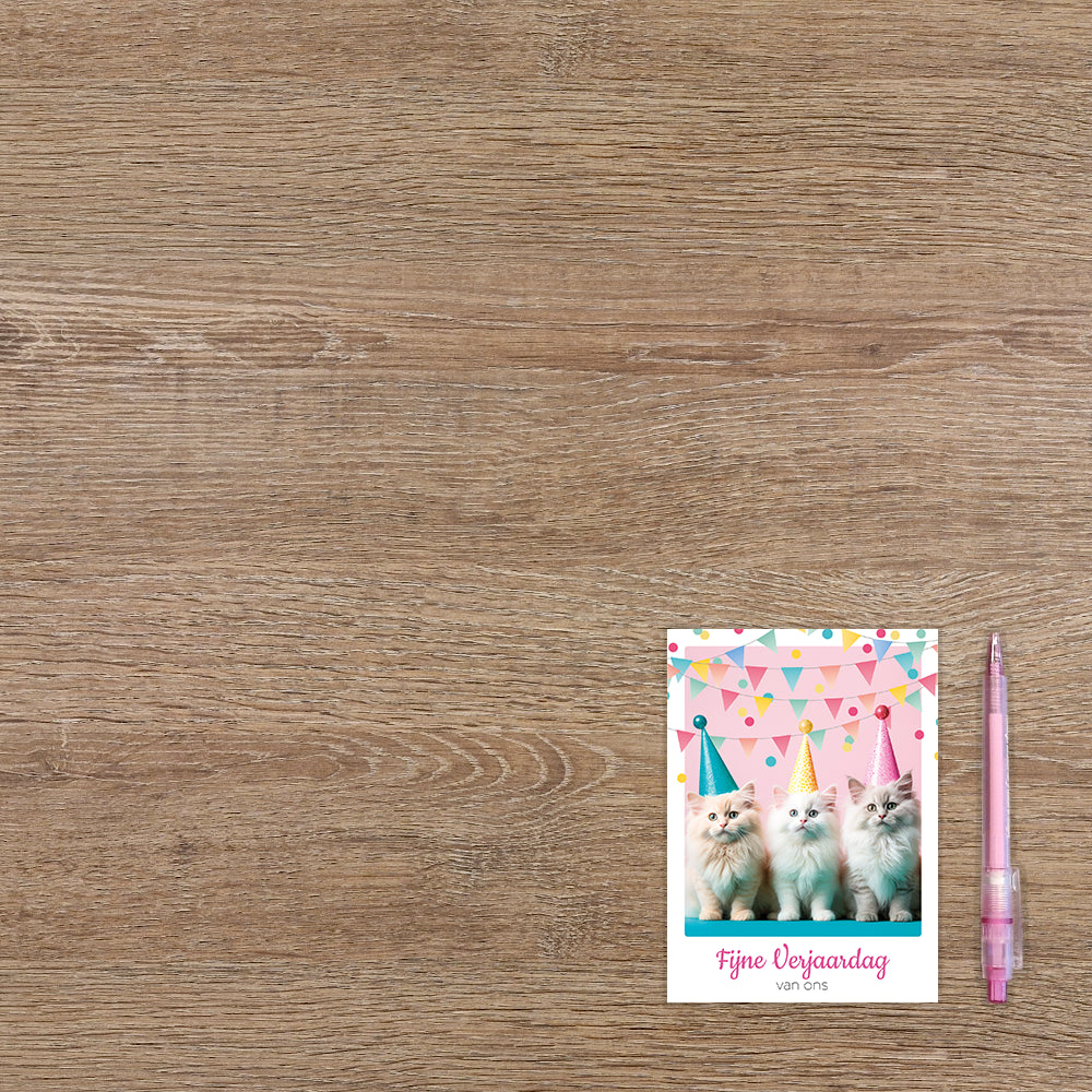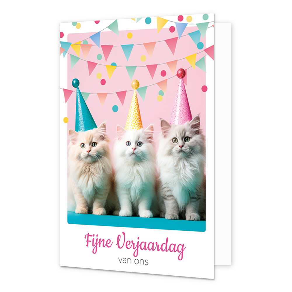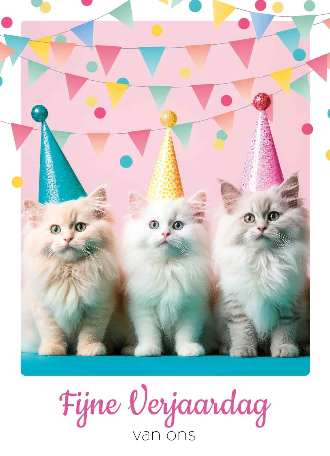 De wenskaart heeft een afmeting van x en een staande vorm. Op deze wenskaart staan drie katten met feesthoedjes en slingers op de achtergrond. Onder de illustratie staat de tekst: "Fijne verjaardag van ons". De binnenzijde van de wenskaart is blanco wat voldoende ruimte geeft om een persoonlijke boodschap te schrijven .