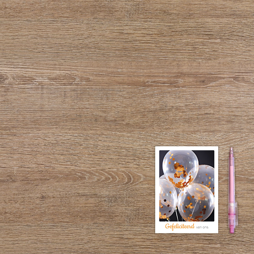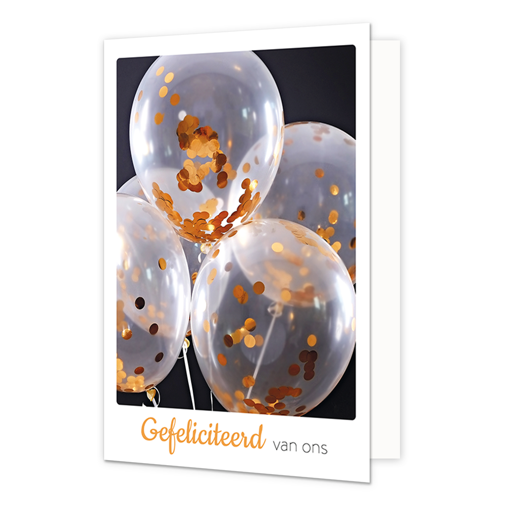 De wenskaart heeft een afmeting van x en een staande vorm. Op deze wenskaart staan doorzichtige ballonnen met daarin gouden confetti. Onder de illustratie staat de tekst: "Gefeliciteerd van ons". De binnenzijde van de wenskaart is blanco wat voldoende ruimte geeft om een persoonlijke boodschap te schrijven .