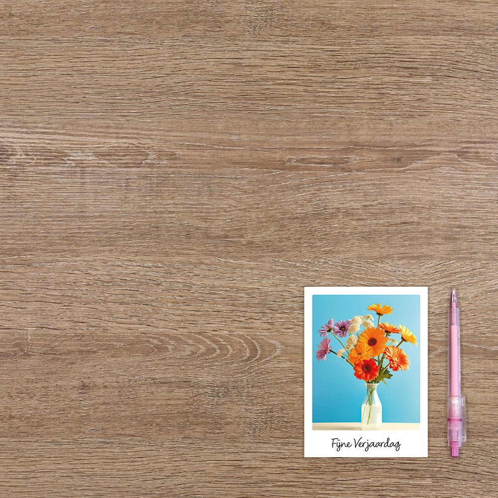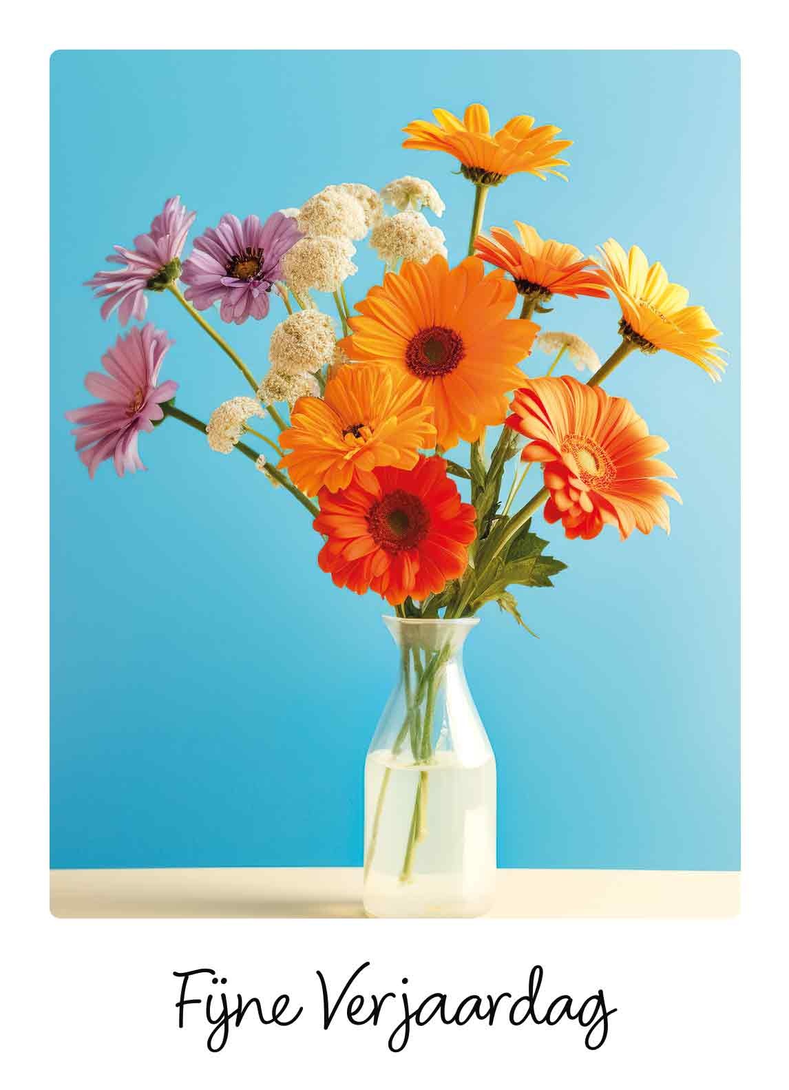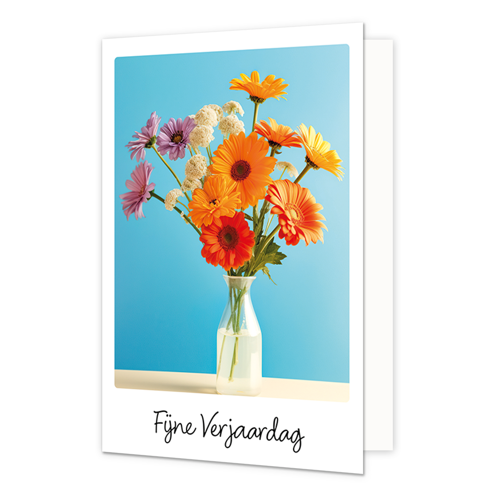 De wenskaart heeft een afmeting van x en een staande vorm. Op deze wenskaart staat een vaas met bloemen in de kleuren oranje, beige en paars. Onder de illustratie staat de tekst: "Fijne verjaardag". De binnenzijde van de wenskaart is blanco wat voldoende ruimte geeft om een persoonlijke boodschap te schrijven .