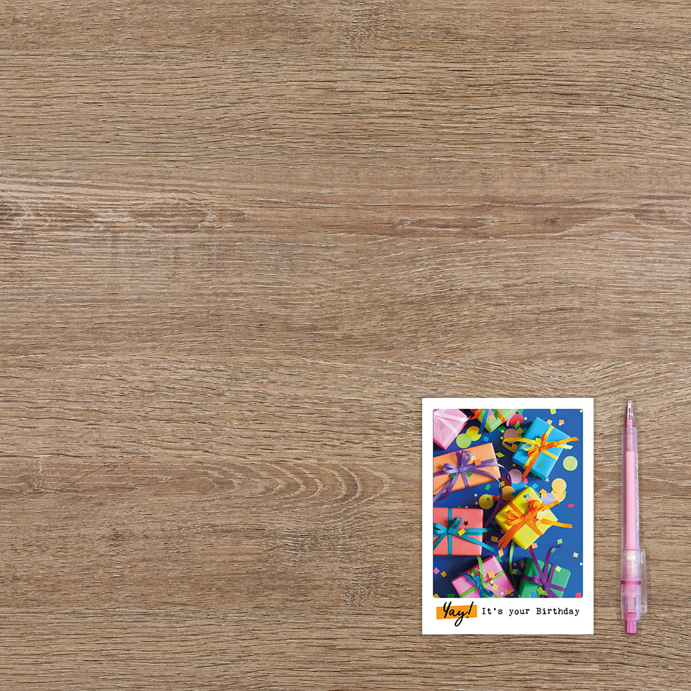 De wenskaart heeft een afmeting van x en een staande vorm. Op deze wenskaart staan cadeaus en confetti met daaronder de tekst: "Yay! It's your birthday". De binnenzijde van de wenskaart is blanco wat voldoende ruimte geeft om een persoonlijke boodschap te schrijven .