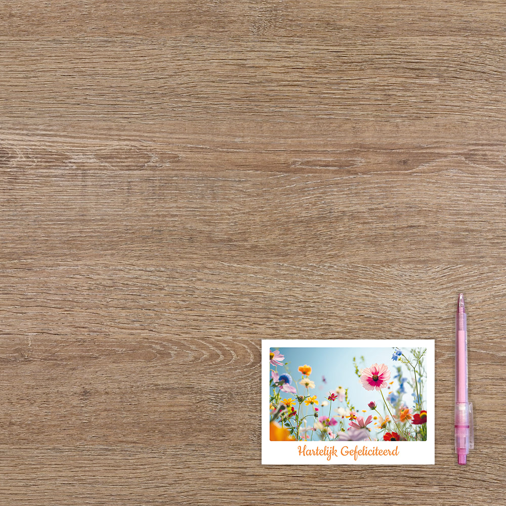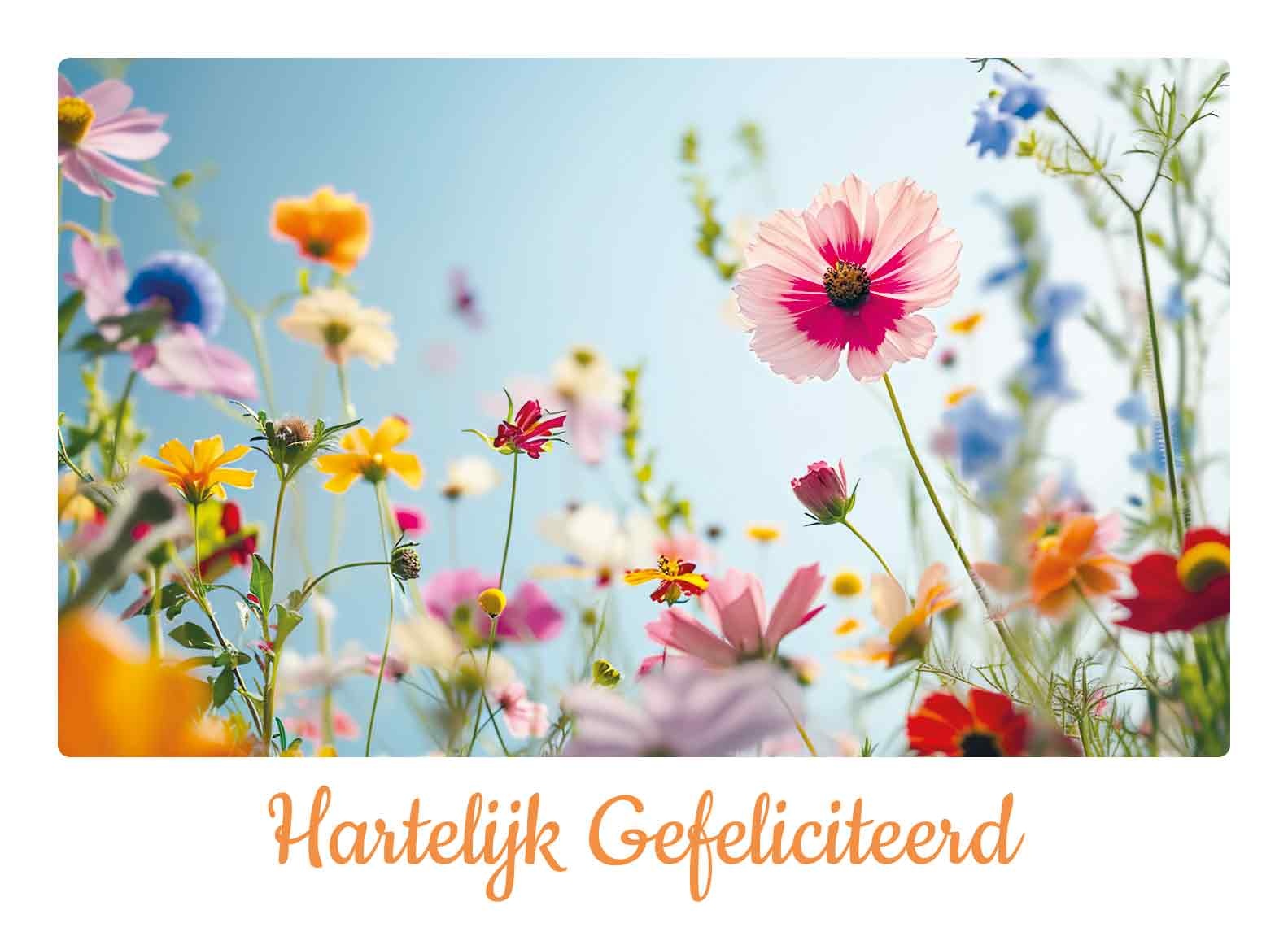 De wenskaart heeft een afmeting van x en een liggende vorm. Op deze wenskaart staat een bloemenveld met de kleuren roze, blauw, geel, oranje, paars, rood en groen. Onder de illustratie staat de tekst: "Hartelijk gefeliciteerd". De binnenzijde van de wenskaart is blanco wat voldoende ruimte geeft om een persoonlijke boodschap te schrijven .