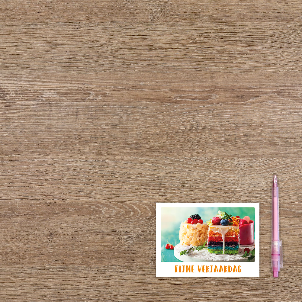 De wenskaart heeft een afmeting van x en een liggende vorm. Op deze wenskaart staan drie taartjes waaronder een regenboogtaartje. Onder de illustratie staat de tekst: "Fijne verjaardag". De binnenzijde van de wenskaart is blanco wat voldoende ruimte geeft om een persoonlijke boodschap te schrijven .