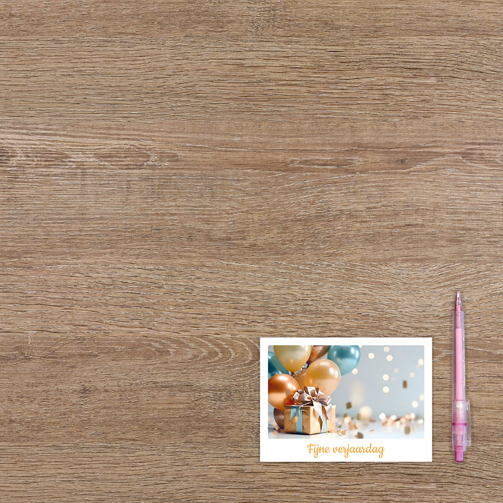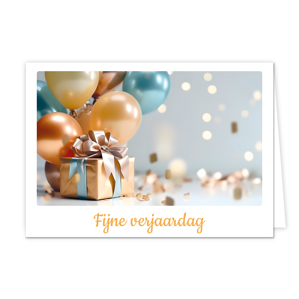 De wenskaart heeft een afmeting van x en een liggende vorm. Op deze wenskaart staan ballonnen, een cadeautje en confetti met daaronder de tekst: "Fijne verjaardag". De binnenzijde van de wenskaart is blanco wat voldoende ruimte geeft om een persoonlijke boodschap te schrijven .