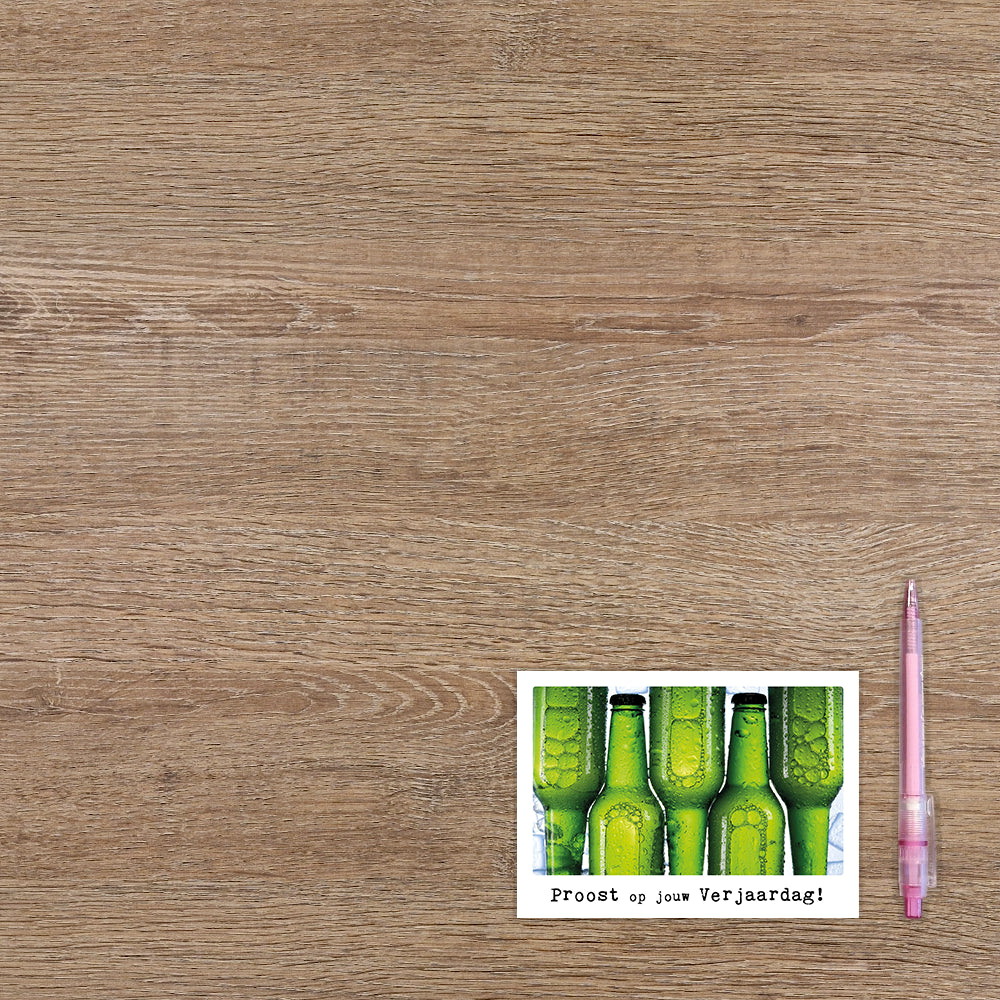 De wenskaart heeft een afmeting van x en een liggende vorm. Op deze wenskaart staan 5 bierflesjes met daaronder de tekst: "Proost op je verjaardag!" De binnenzijde van de wenskaart is blanco wat voldoende ruimte geeft om een persoonlijke boodschap te schrijven .