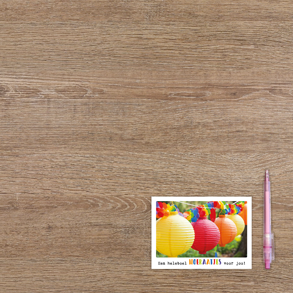 De wenskaart heeft een afmeting van x en een liggende vorm. Op deze wenskaart staat een slinger van lampionnen in de kleuren geel, rood en oranje. Onder de illustratie staat de tekst: "Een heleboel hoeraatjes voor jou!". De binnenzijde van de wenskaart is blanco wat voldoende ruimte geeft om een persoonlijke boodschap te schrijven .