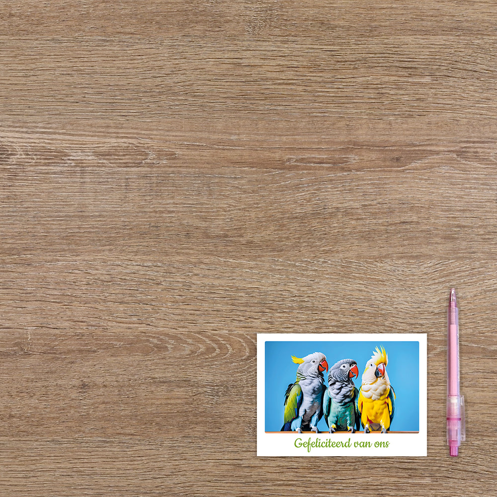 De wenskaart heeft een afmeting van x en een liggende vorm. Op deze wenskaart staan drie vogels met daaronder de tekst: "Gefeliciteerd van ons". De binnenzijde van de wenskaart is blanco wat voldoende ruimte geeft om een persoonlijke boodschap te schrijven .