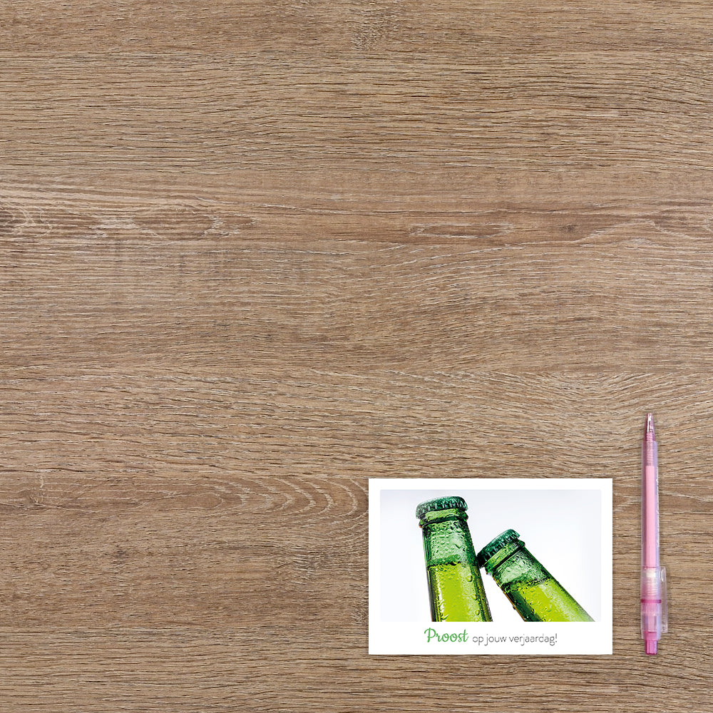 De wenskaart heeft een afmeting van x en een liggende vorm. Op deze wenskaart staan twee bierflesjes met daaronder de tekst: "Proost op jouw verjaardag!". De binnenzijde van de wenskaart is blanco wat voldoende ruimte geeft om een persoonlijke boodschap te schrijven .