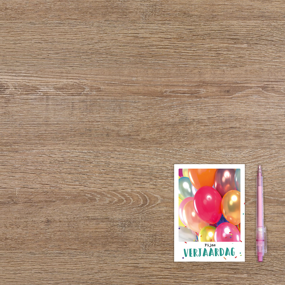 De wenskaart heeft een afmeting van x en een staande vorm. Op deze wenskaart staan ballonnen in de kleuren rood, oranje, roze, goud, geel en blauw. Onder de illustratie staat de tekst: "Fijne verjaardag". De binnenzijde van de wenskaart is blanco wat voldoende ruimte geeft om een persoonlijke boodschap te schrijven .