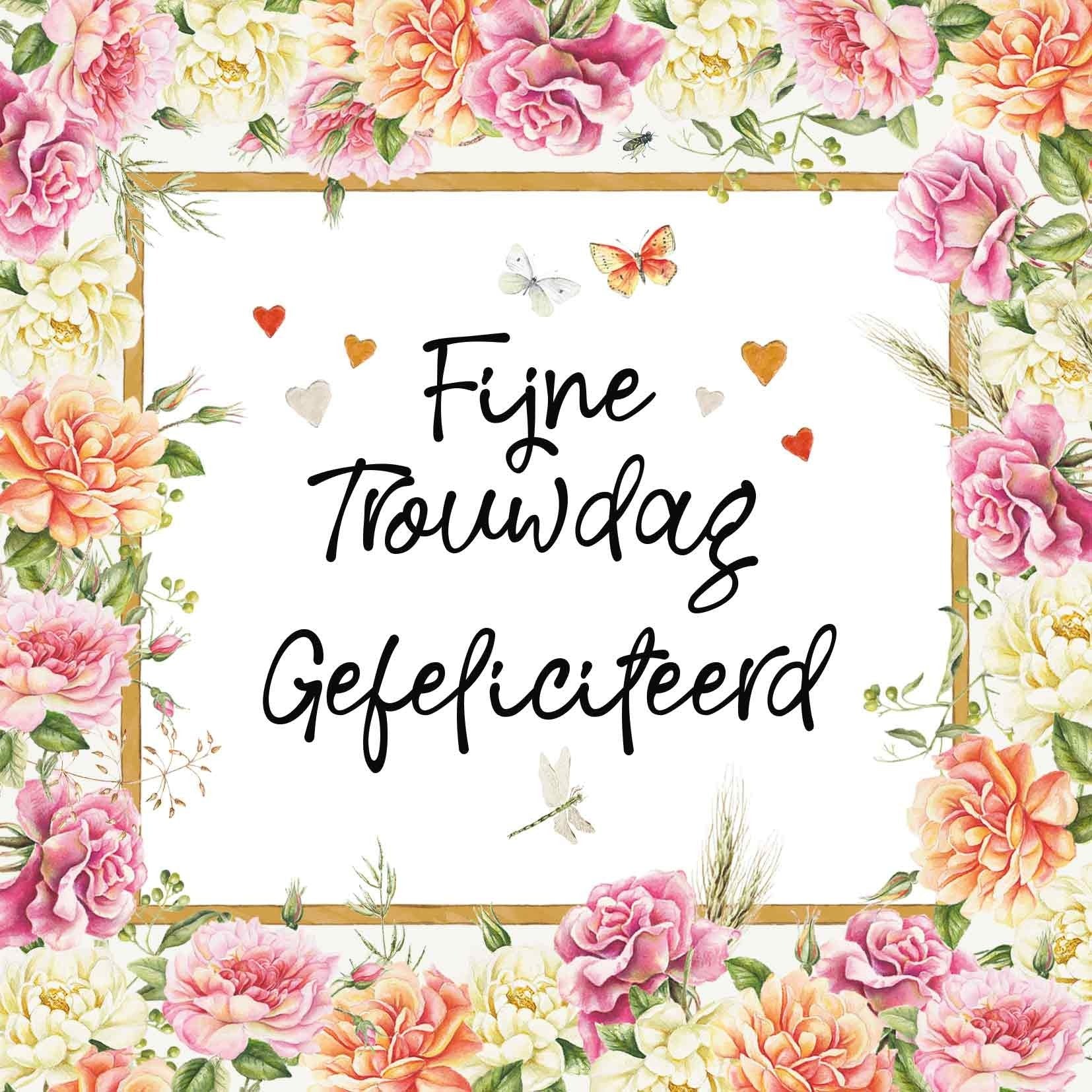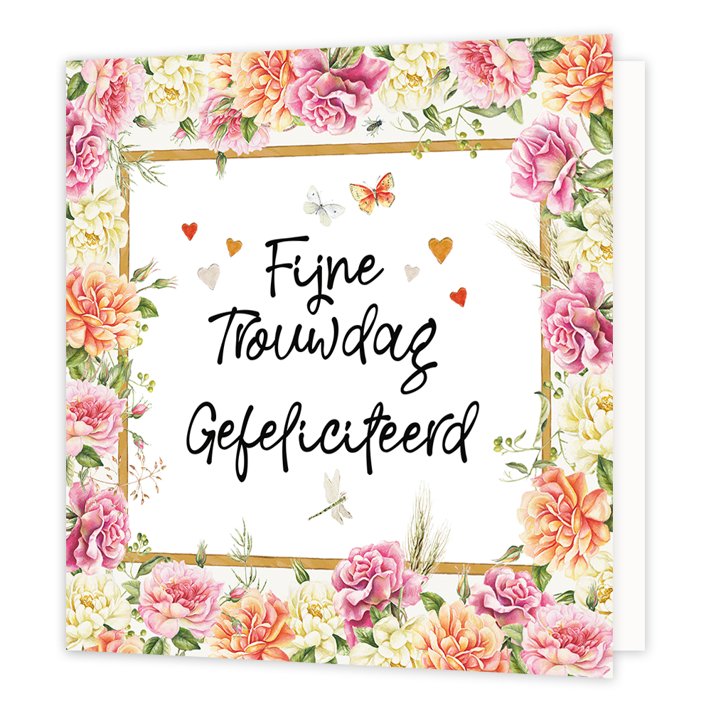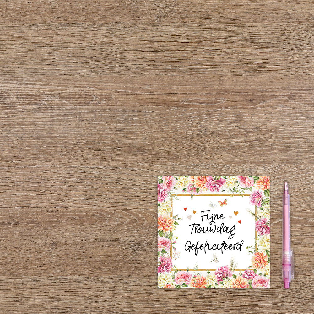 De wenskaart heeft een afmeting van x en een vierkante vorm. Op deze wenskaart staan bloemen in de kleuren geel, roanje en roze. In het midden zit een wit blok met de tekst: "Fijne trouwdag gefeliciteerd". De binnenzijde van de wenskaart is blanco wat voldoende ruimte geeft om een persoonlijke boodschap te schrijven .