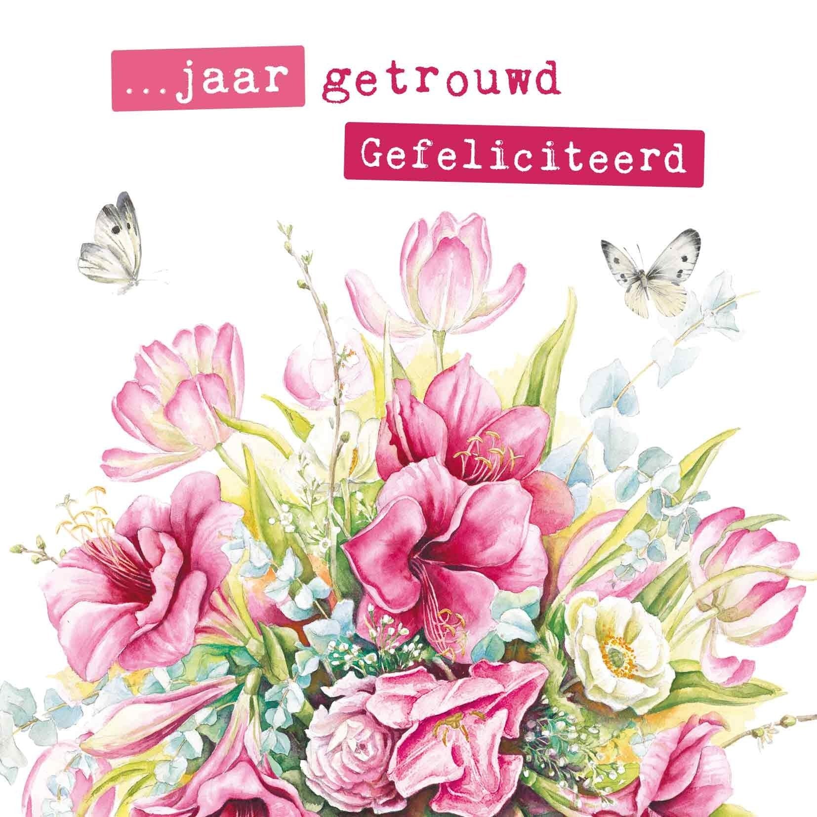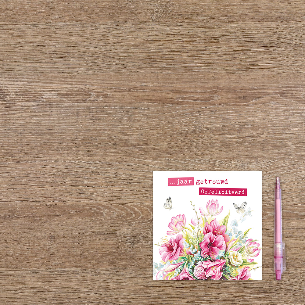 De wenskaart heeft een afmeting van x en een vierkante vorm. Op deze wenskaart staan bloemen in de kleuren roze, geel en blauw. Boven aan staat de tekst: "... jaar getrouwd gefeliciteerd". De binnenzijde van de wenskaart is blanco wat voldoende ruimte geeft om een persoonlijke boodschap te schrijven .