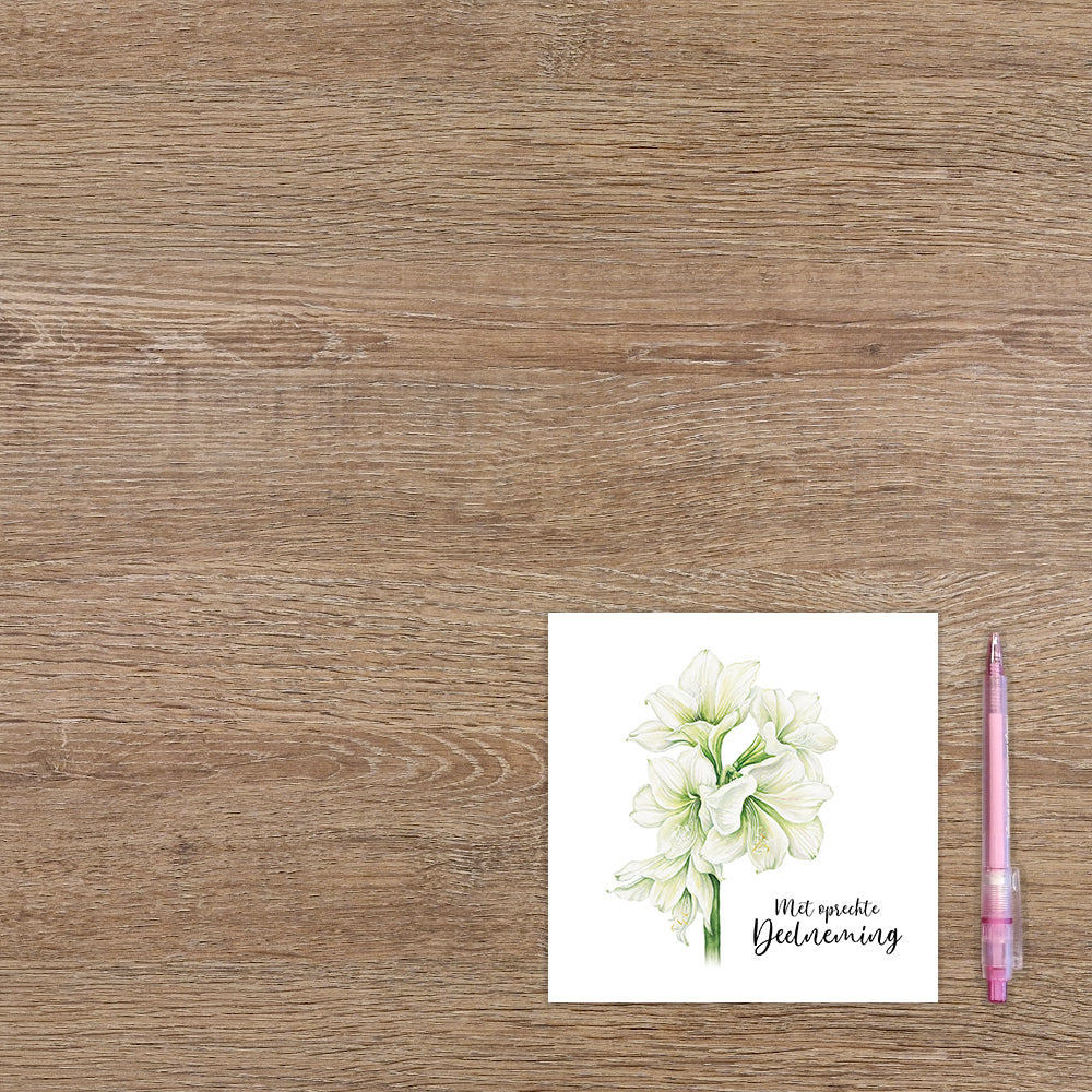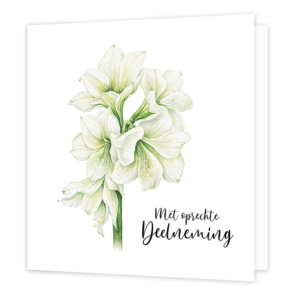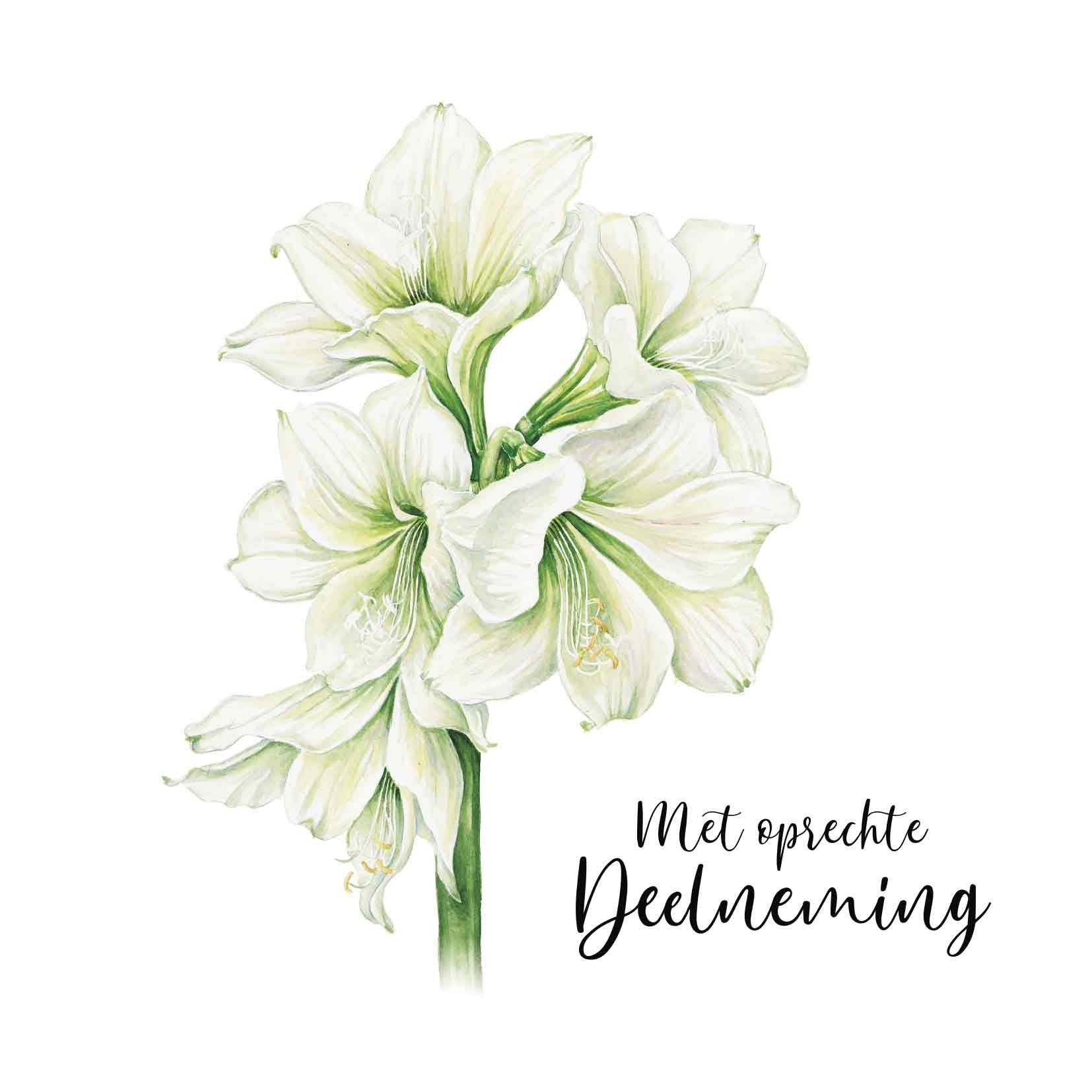 De wenskaart heeft een afmeting van x en een vierkante vorm. Op deze wenskaart staan witte bloemen met rechts daaronder de tekst: "Met oprechte deelneming". De binnenzijde van de wenskaart is blanco wat voldoende ruimte geeft om een persoonlijke boodschap te schrijven .