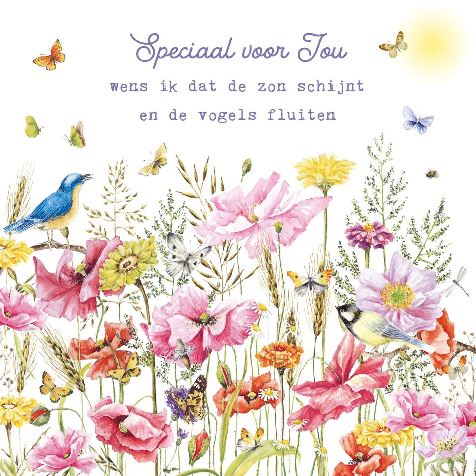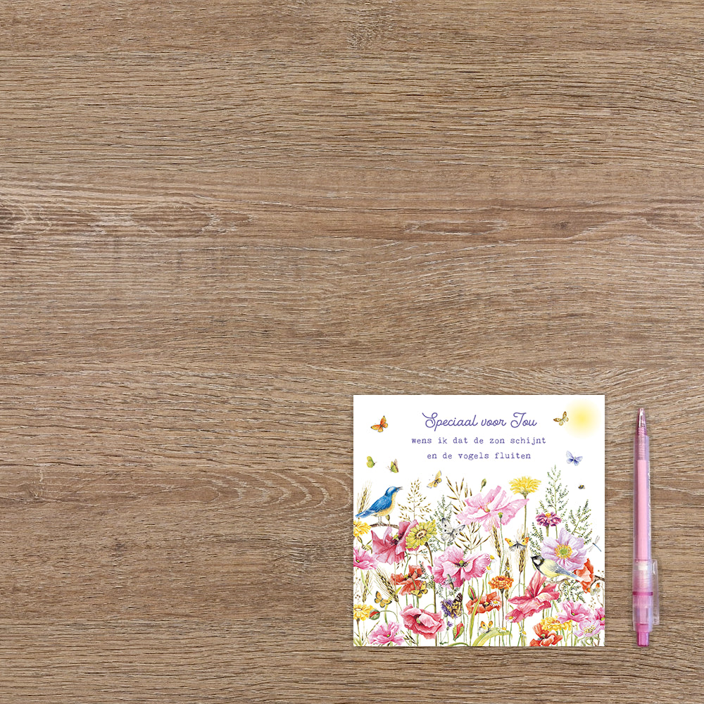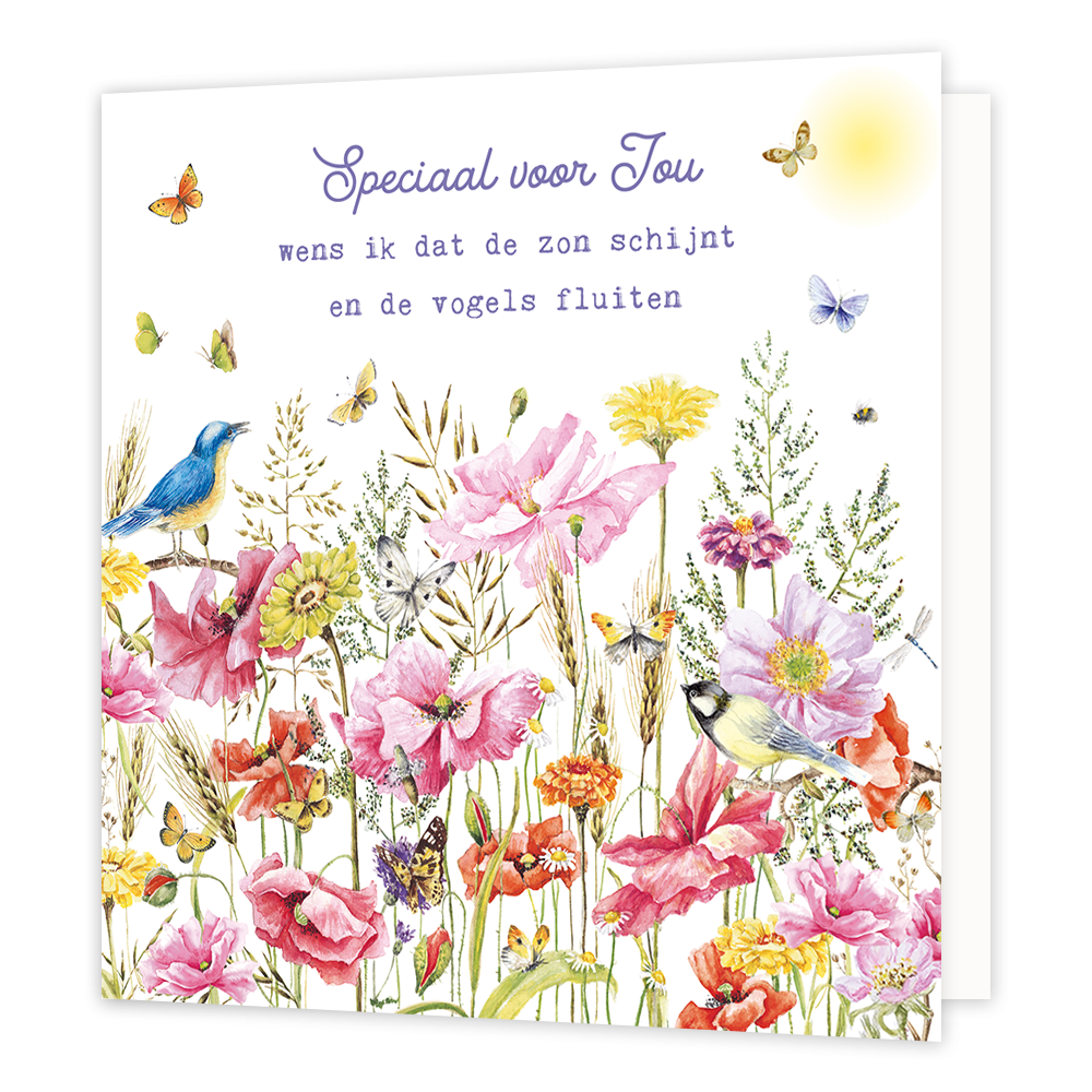 De wenskaart heeft een afmeting van x en een vierkante vorm. Op deze wenskaart staat een bloemenveld in de kleuren oranje, roze, geel, paars, rood en groen, met vogels en vlinders. Daarboven staat de tekst: "Speciaal voor jou wen sik dat de zon schijnt en de vogels fluiten". De binnenzijde van de wenskaart is blanco wat voldoende ruimte geeft om een persoonlijke boodschap te schrijven .