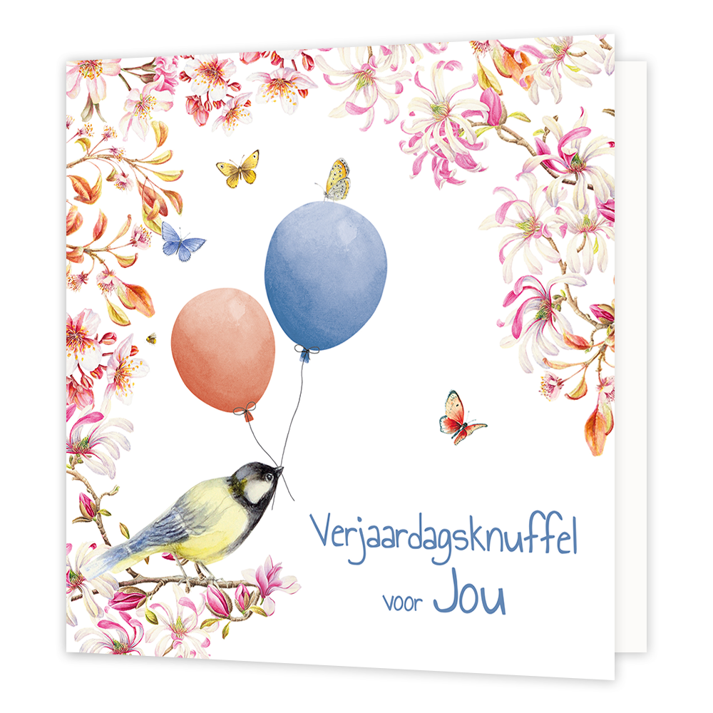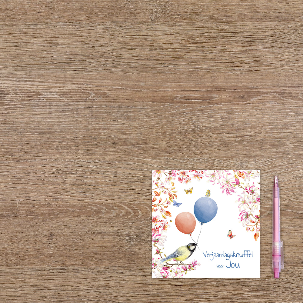 De wenskaart heeft een afmeting van x en een vierkante vorm. Op deze wenskaart staat een vogel die twee ballonnen vast houdt met daaromheen bloemen. Rechts onderin staat de tekst: "Verjaardagsknuffel voor jou". De binnenzijde van de wenskaart is blanco wat voldoende ruimte geeft om een persoonlijke boodschap te schrijven .