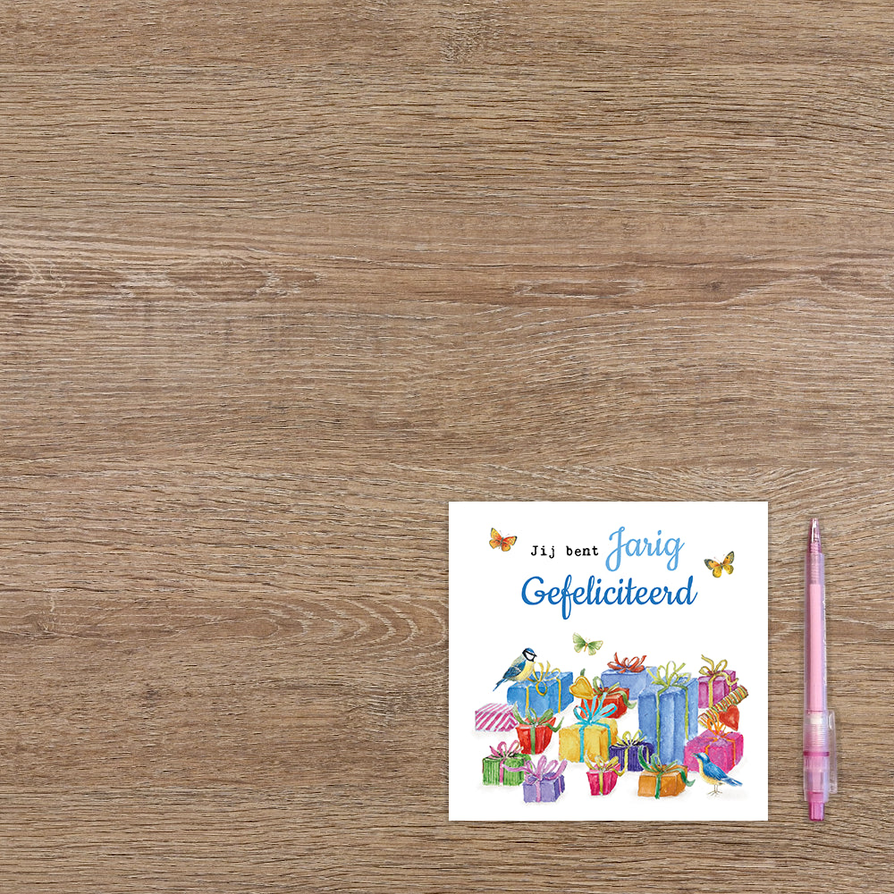 De wenskaart heeft een afmeting van x en een vierkante vorm. Op deze wenskaart staan cadeaus met een vogel en vlinders. Daarboven staat de tekst "Jij bent jarig gefeliciteerd". De binnenzijde van de wenskaart is blanco wat voldoende ruimte geeft om een persoonlijke boodschap te schrijven .
