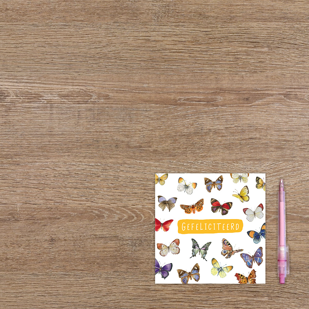 De wenskaart heeft een afmeting van x en een vierkante vorm. Op deze wenskaart staan vlinders in de kleuren paars, geel, rood, oranje, wit, blauw, en bruin. In het midden staat de tekst: "Gefliciteerd". De binnenzijde van de wenskaart is blanco wat voldoende ruimte geeft om een persoonlijke boodschap te schrijven .