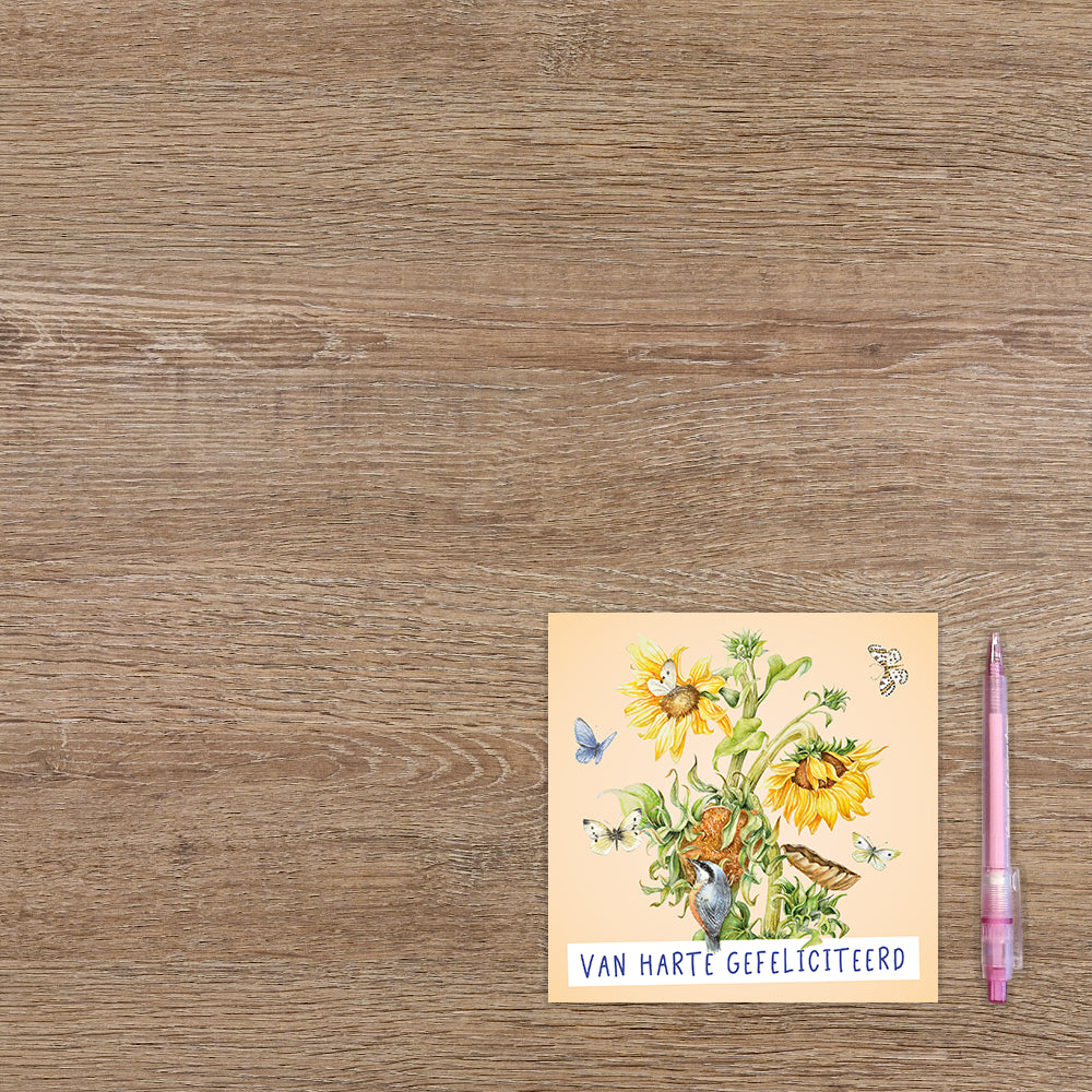 De wenskaart heeft een afmeting van x en een vierkante vorm. Op deze wenskaart staan zonnebloemen omringt door vogels en vlinders. Onderaan staat de tekst: "Van harte gefeliciteerd". De binnenzijde van de wenskaart is blanco wat voldoende ruimte geeft om een persoonlijke boodschap te schrijven .