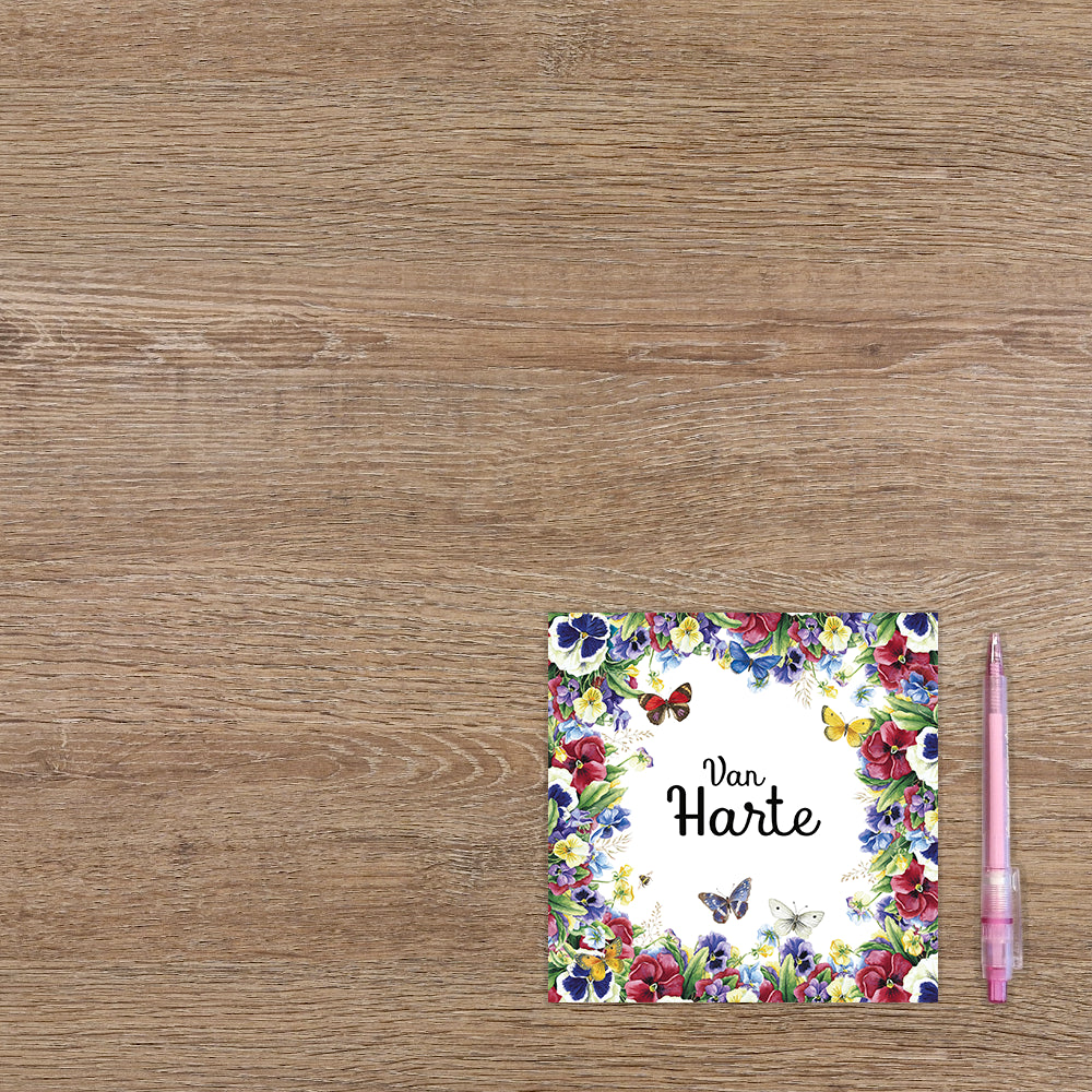 De wenskaart heeft een afmeting van x en een vierkante vorm. Op deze wenskaart staan bloemen in de kleuren paars, blauw, geel rood en groen. In staan vlinders en de tekst: "Van harte". De binnenzijde van de wenskaart is blanco wat voldoende ruimte geeft om een persoonlijke boodschap te schrijven .