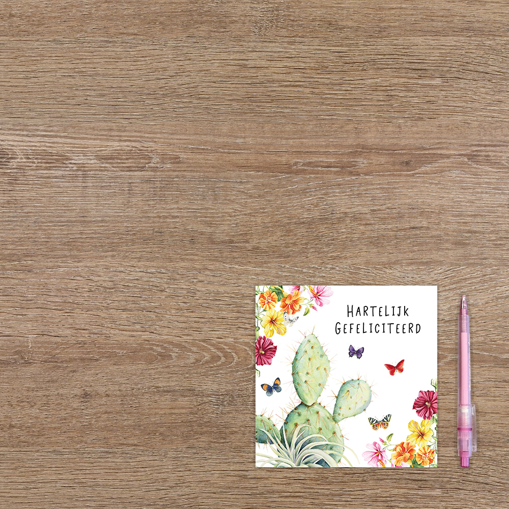 De wenskaart heeft een afmeting van x en een vierkante vorm. Op deze wenskaart staat een cactus met daar omheen bloemen en vlinders. Rechts bovenin staat de tekst: "Hartelijk gefeliciteerd". De binnenzijde van de wenskaart is blanco wat voldoende ruimte geeft om een persoonlijke boodschap te schrijven .