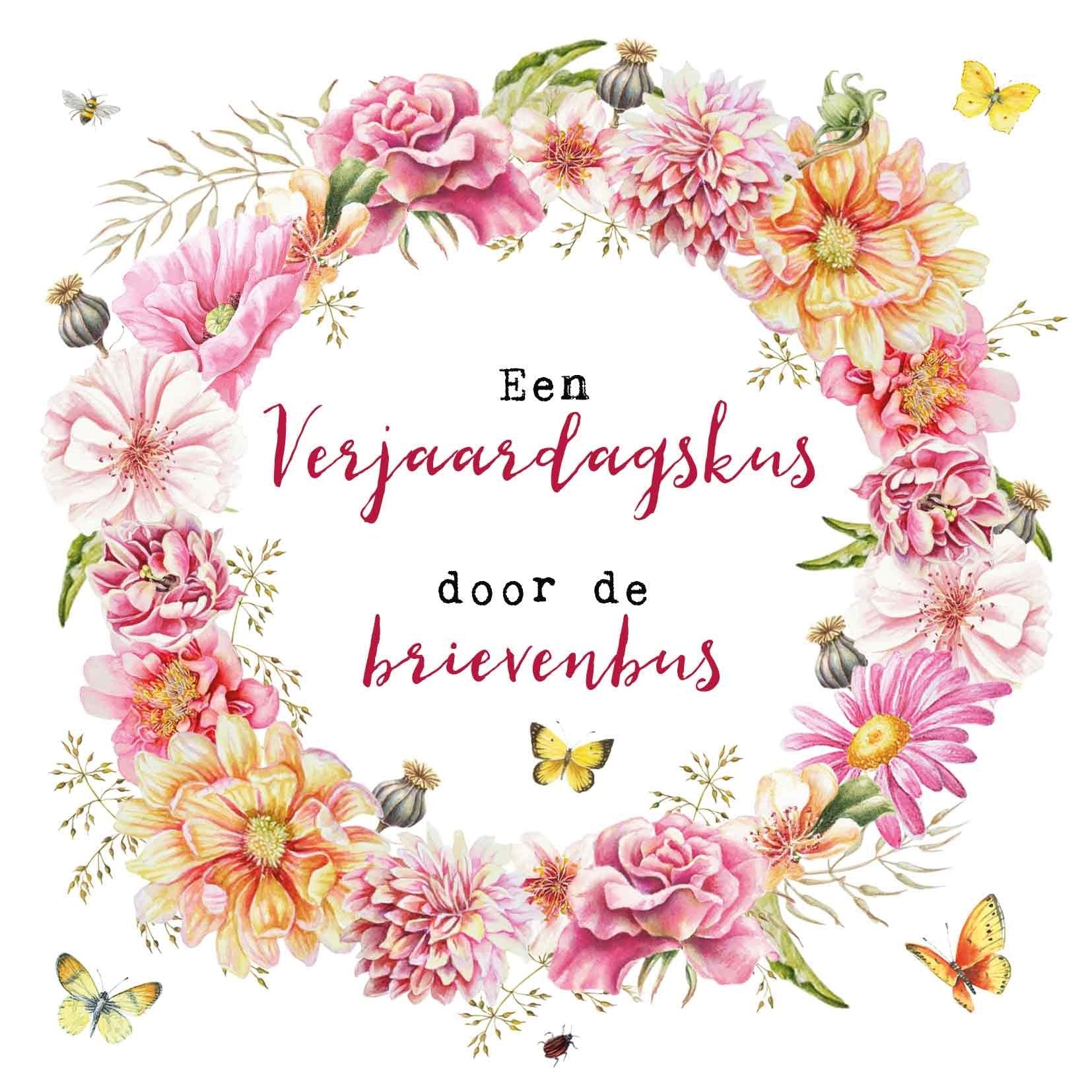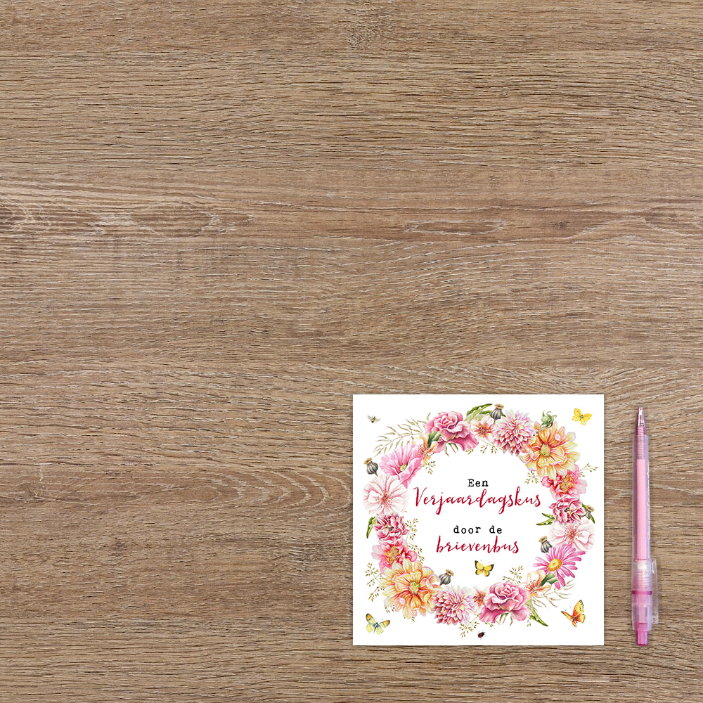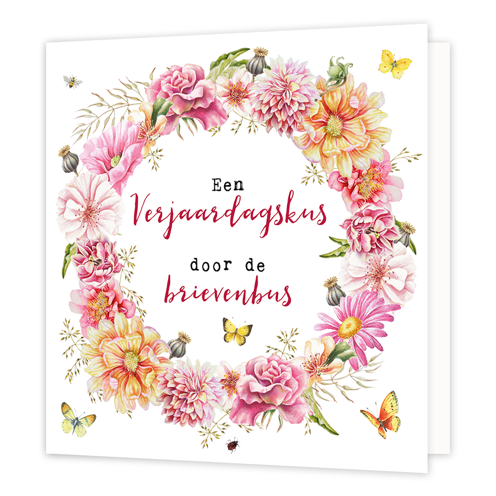 De wenskaart heeft een afmeting van x en een vierkante vorm. Op deze wenskaart staan bloemen in een cirkel in de kleuren roze, beige, oranje en geel. In het midden staat de tekst: "Een verjaardagskus door de brievenbus". De binnenzijde van de wenskaart is blanco wat voldoende ruimte geeft om een persoonlijke boodschap te schrijven .