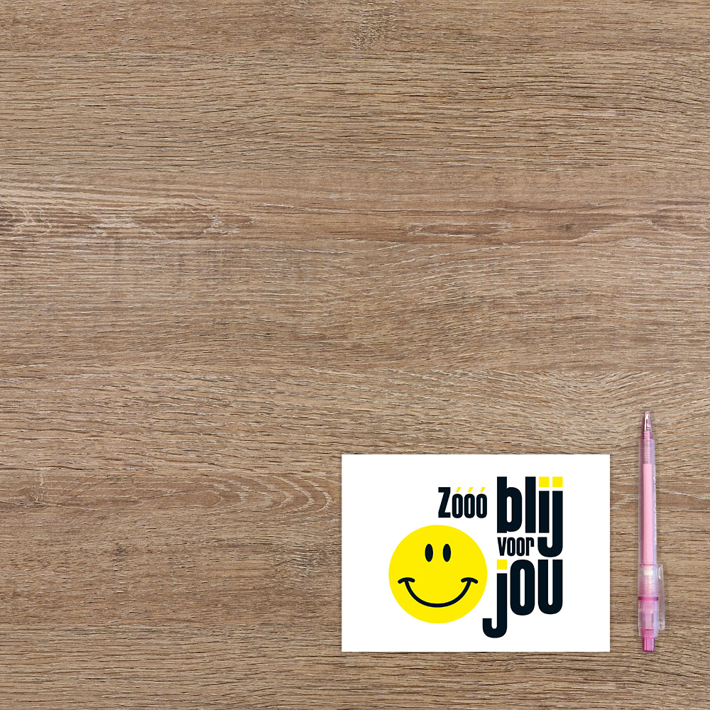 De wenskaart heeft een afmeting van x en een liggende vorm. Op deze wenskaart staat een smiley met daarnaast de tekst: "Zó blij met jou". De binnenzijde van de wenskaart is blanco wat voldoende ruimte geeft om een persoonlijke boodschap te schrijven .