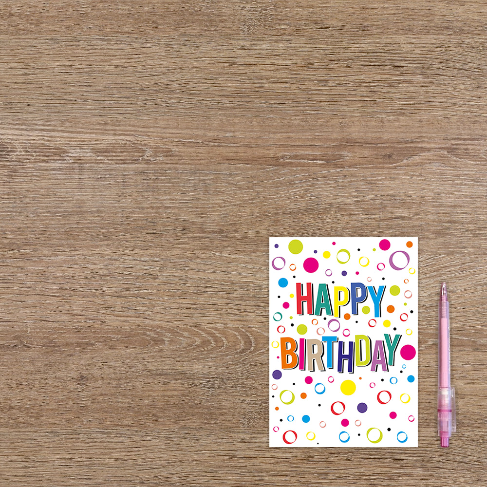 De wenskaart heeft een afmeting van x en een staande vorm. Op deze wenskaart staan stippen in de kleuren roze, groen, geel, oranje, paars en blauw. In het midden staat de tekst: "Happy birthday". De binnenzijde van de wenskaart is blanco wat voldoende ruimte geeft om een persoonlijke boodschap te schrijven .