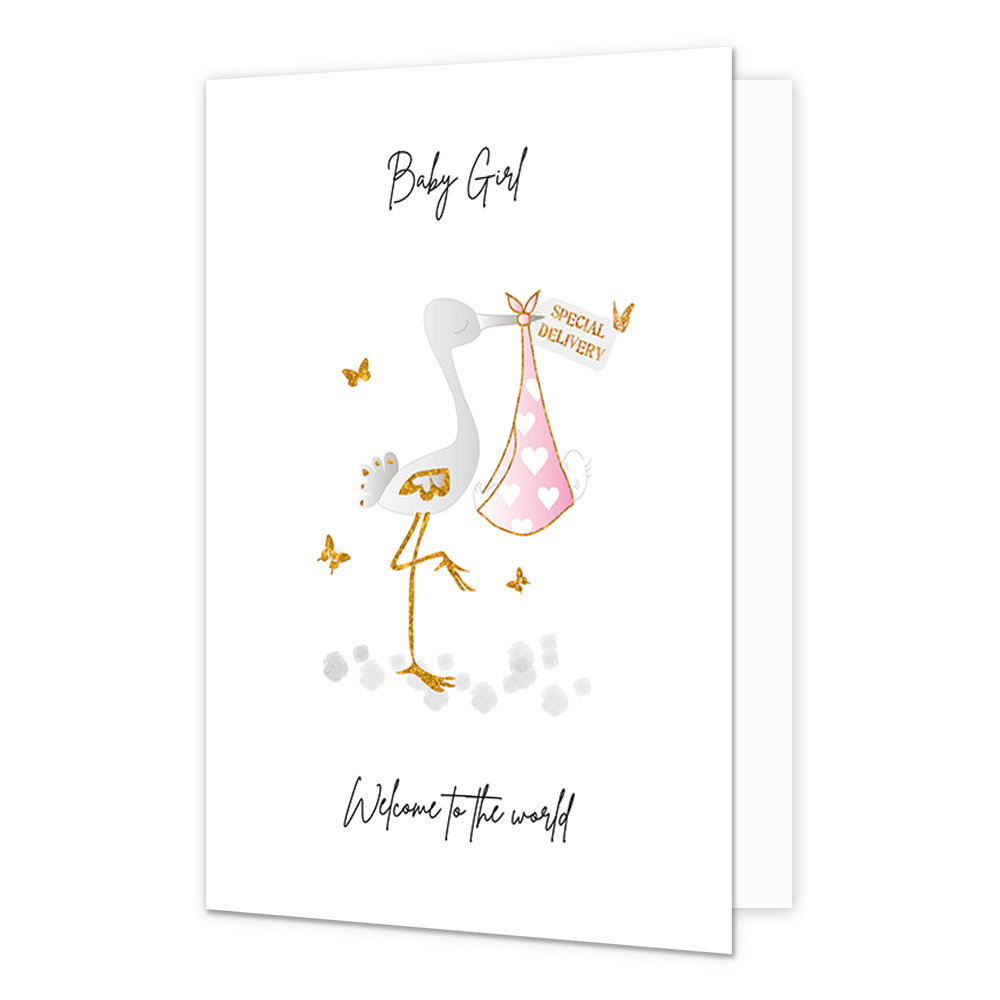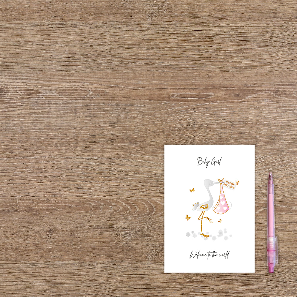 De wenskaart heeft een afmeting van x en een staande vorm. Op deze wenskaart staat een ooievaar die een baby in een roze deken vasthoud met de tekst: "Baby Girl welcome to the world". De binnenzijde van de wenskaart is blanco wat voldoende ruimte geeft om een persoonlijke boodschap te schrijven .
