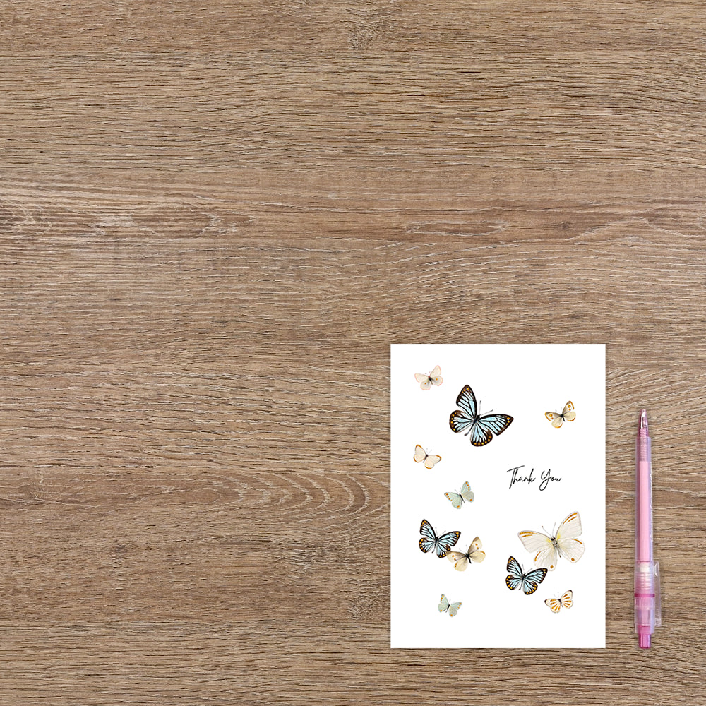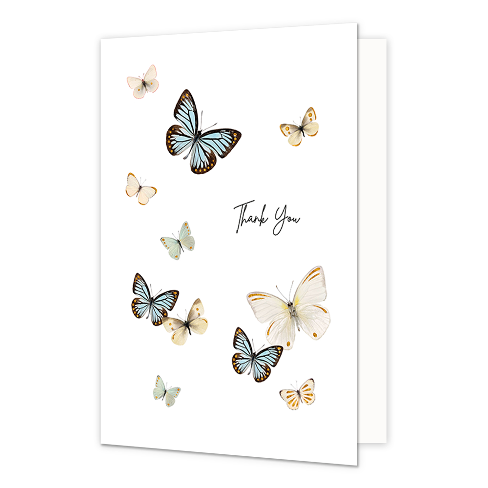 De wenskaart heeft een afmeting van x en een staande vorm. Op deze wenskaart staan vlinders in de kleuren blauw, groen en beige met in het midden de tekst: "Thank you". De binnenzijde van de wenskaart is blanco wat voldoende ruimte geeft om een persoonlijke boodschap te schrijven .