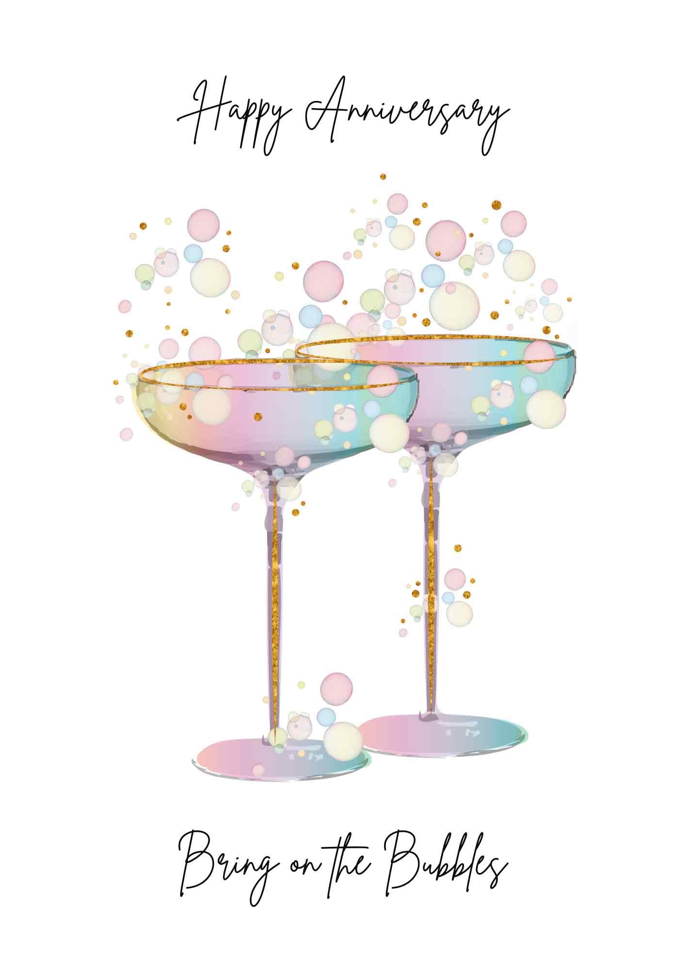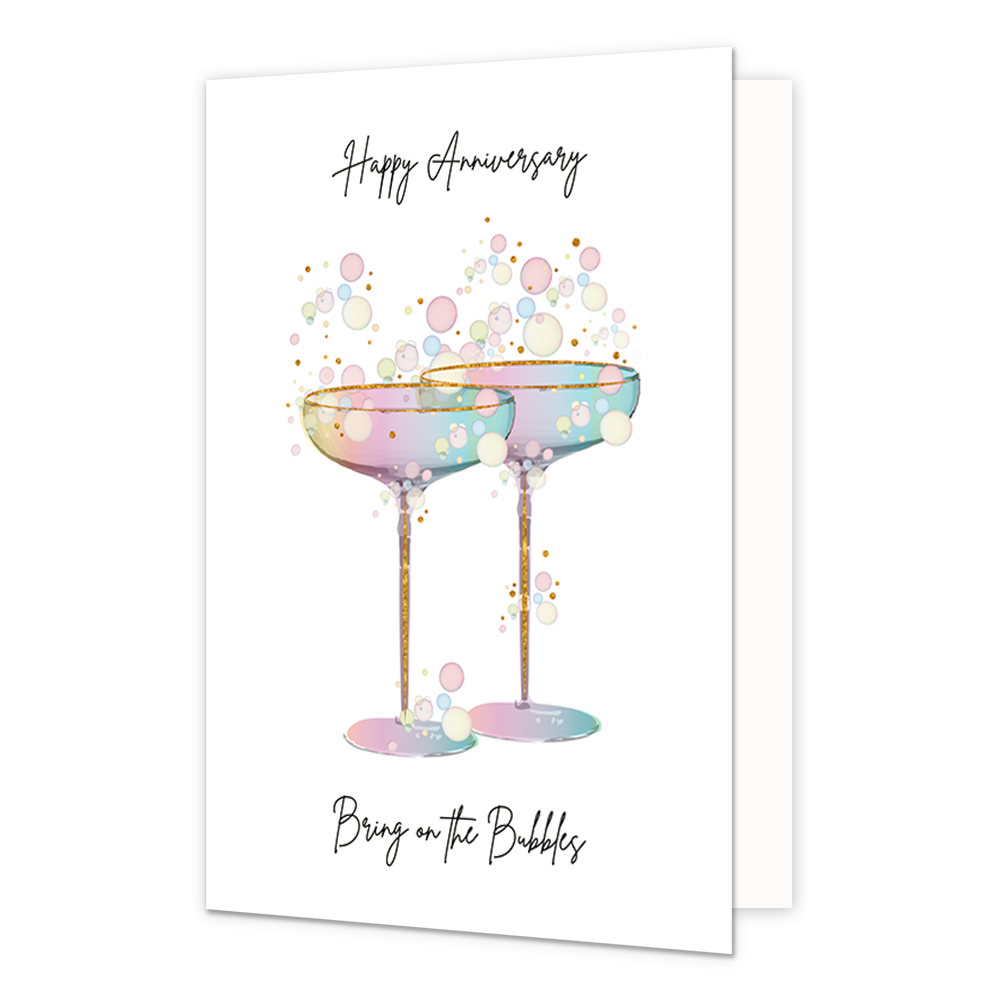 De wenskaart heeft een afmeting van x en een staande vorm. Op deze wenskaart staan champagneglazen waar bubbels vanuit komen in de kleuren roze, geel en blauw. In de illustratie staan de teksten: "Happy Aniversary" en "Bring on the bubbles". De binnenzijde van de wenskaart is blanco wat voldoende ruimte geeft om een persoonlijke boodschap te schrijven .