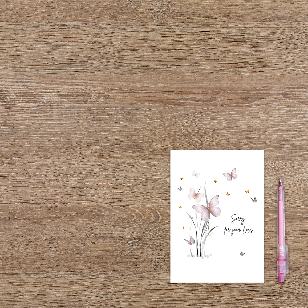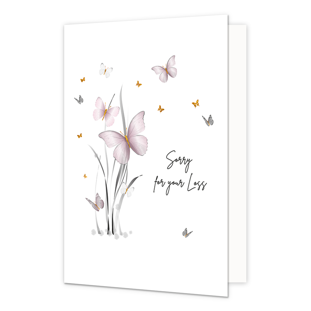 De wenskaart heeft een afmeting van x en een staande vorm. Op deze wenskaart staan vlinders ind e kleuren roze, grijs en goud met onderin de tekst: "Sorry for your loss". De binnenzijde van de wenskaart is blanco wat voldoende ruimte geeft om een persoonlijke boodschap te schrijven .
