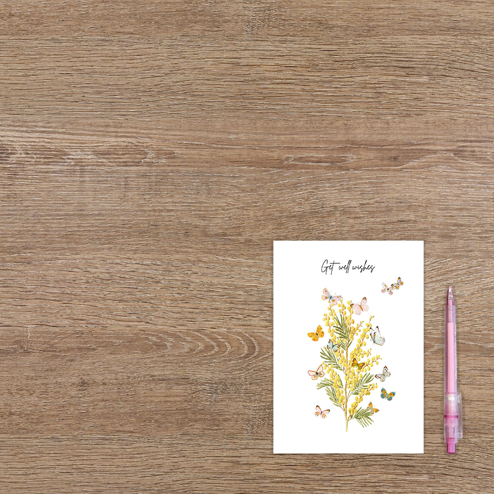 De wenskaart heeft een afmeting van x en een staande vorm. Op deze wenskaart staan vlinders die rondom een gele bloem vliegen. Boven de illustratie staat de tekst: "Get well wishes". De binnenzijde van de wenskaart is blanco wat voldoende ruimte geeft om een persoonlijke boodschap te schrijven .