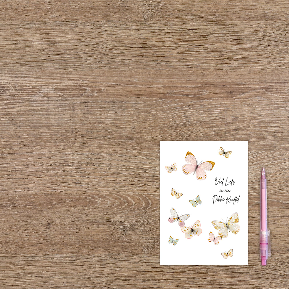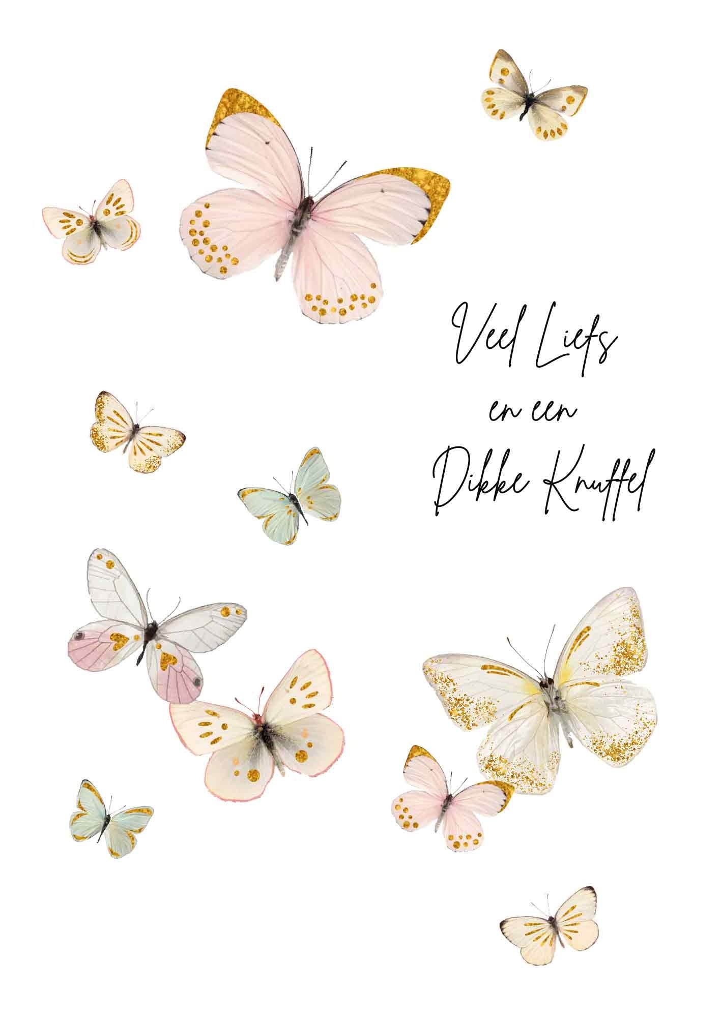 De wenskaart heeft een afmeting van x en een staande vorm. Op deze wenskaart staan vlinders in de kkleuren roze, geel, groen en beige met rechts de tekst: "Veel liefs en een dikke knuffel". De binnenzijde van de wenskaart is blanco wat voldoende ruimte geeft om een persoonlijke boodschap te schrijven .