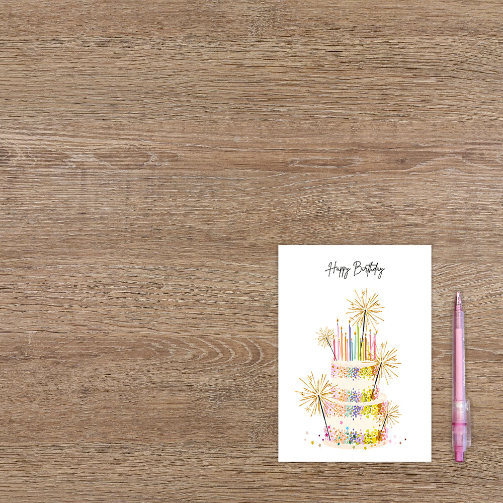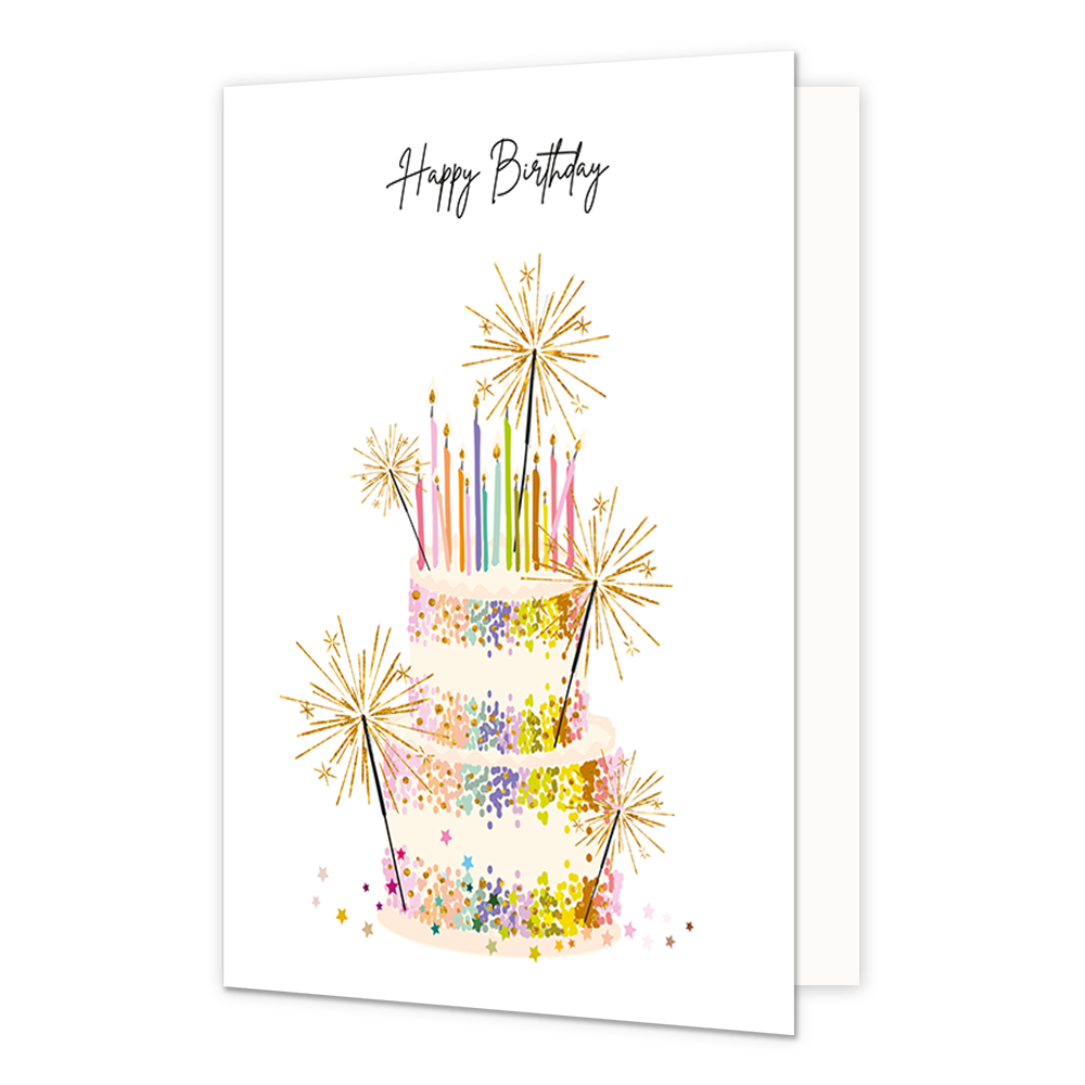 De wenskaart heeft een afmeting van x en een staande vorm. Op deze wenskaart staat een taart met kaarsjes en sterretjes. Boven de illustratie staat de tekst: "Happy birthday". De binnenzijde van de wenskaart is blanco wat voldoende ruimte geeft om een persoonlijke boodschap te schrijven .