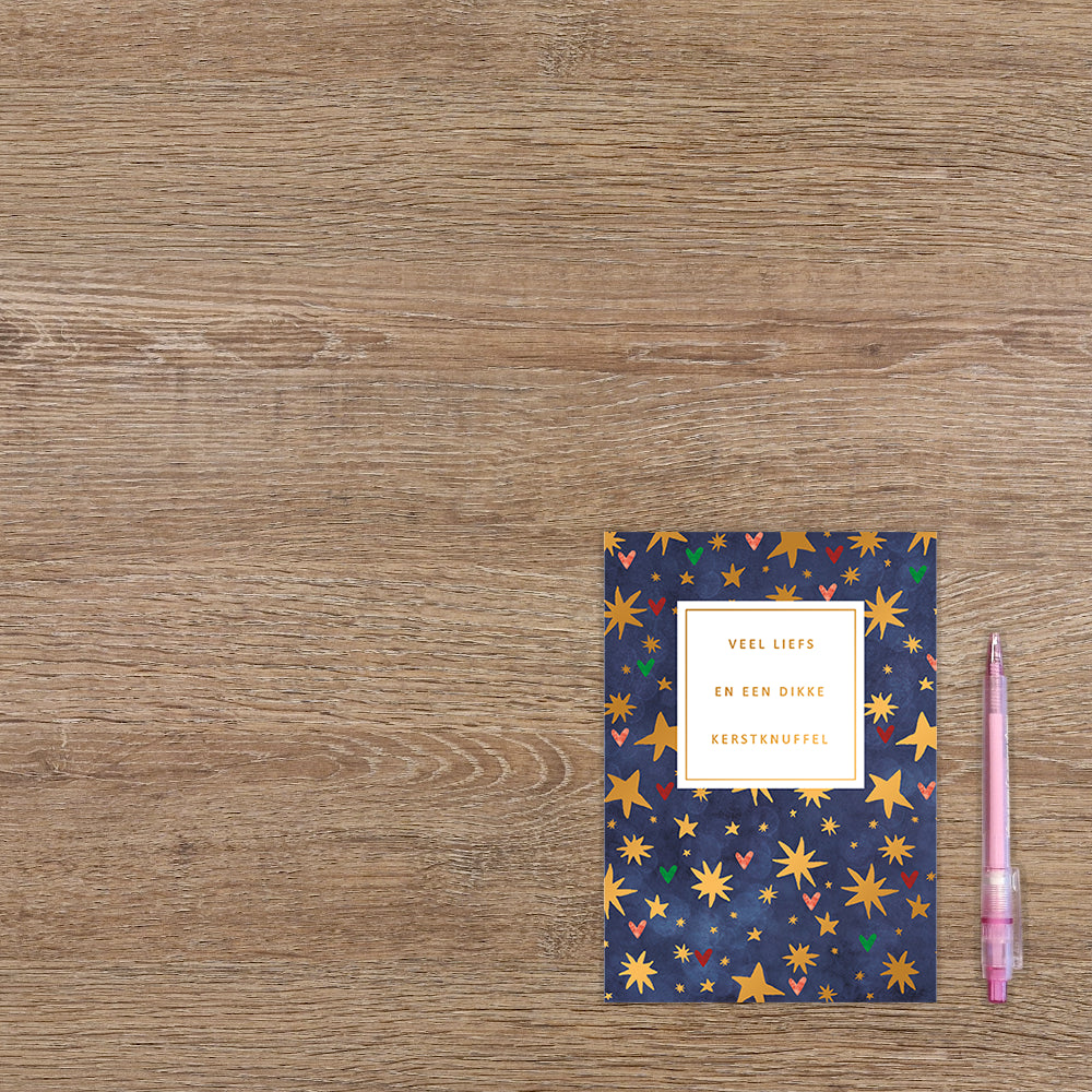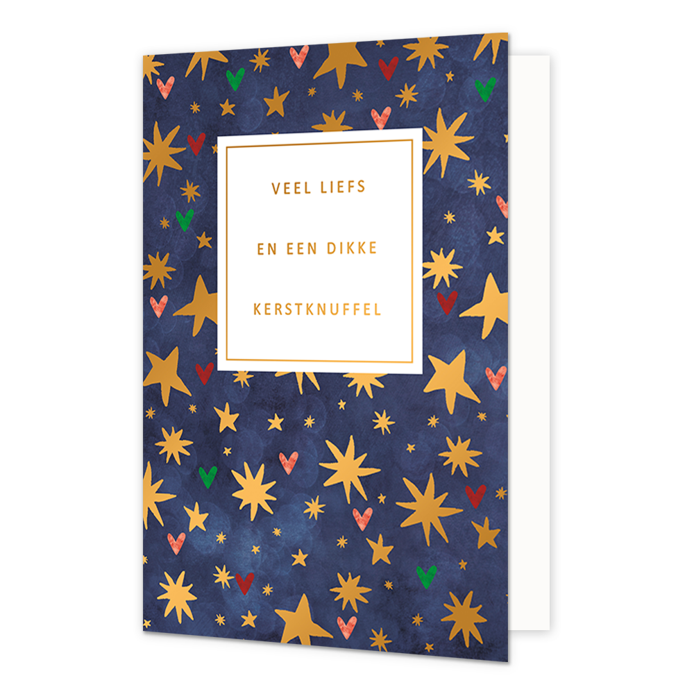 De wenskaart heeft een afmeting van x en een staande vorm. Op deze kerstkaart staan sterren en hartjes in diverse kleuren met in het midden de tekst: "Veel liefs en een dikke kerstknuffel". De binnenzijde van de wenskaart is blanco wat voldoende ruimte geeft om een persoonlijke boodschap te schrijven .