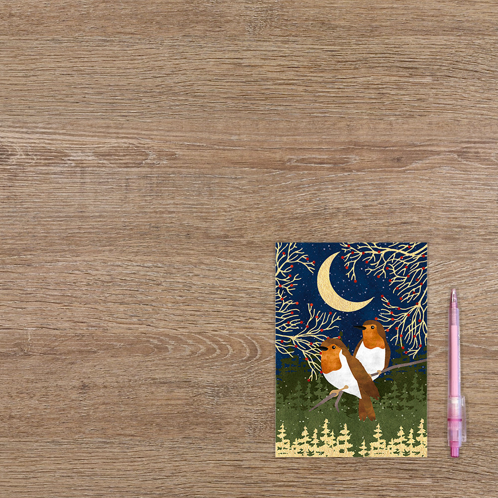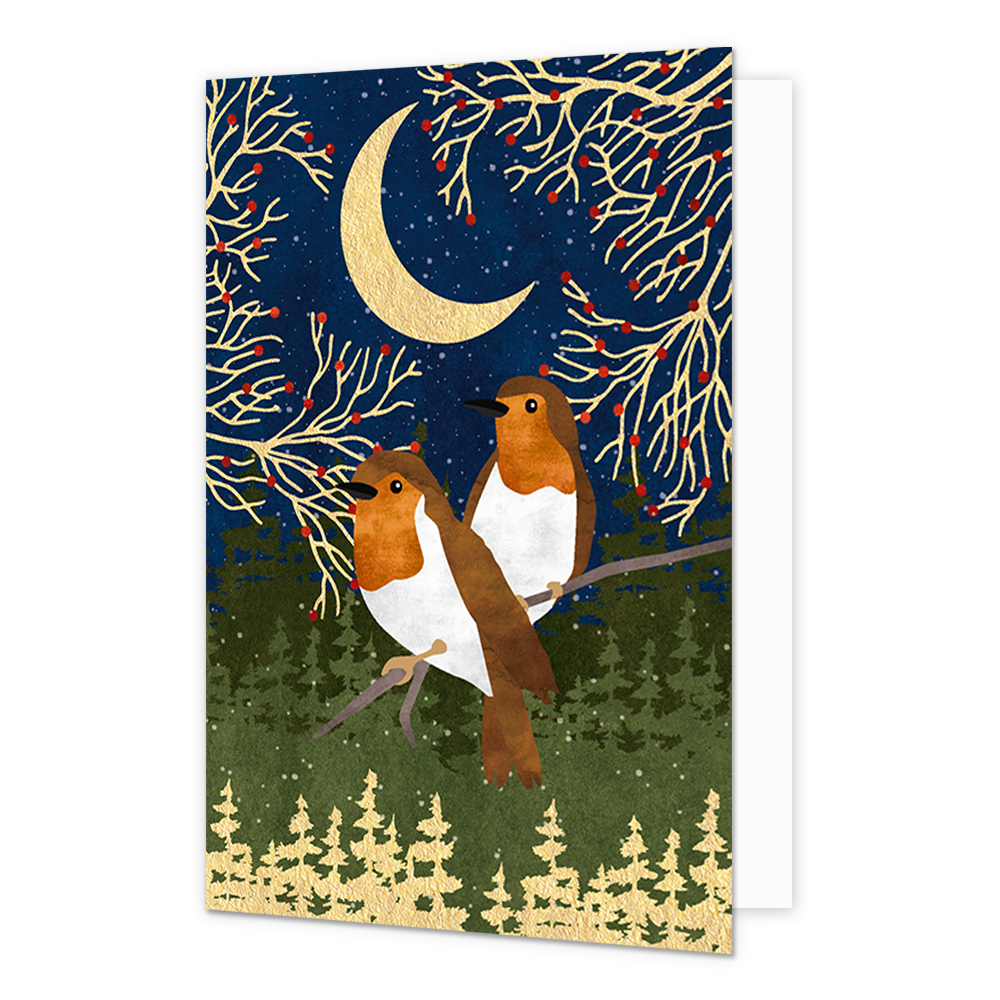 De wenskaart heeft een afmeting van x en een staande vorm. Op deze kerstkaart staan twee vogels die op een tak zitten in een bos. De binnenzijde van de wenskaart is blanco wat voldoende ruimte geeft om een persoonlijke boodschap te schrijven .