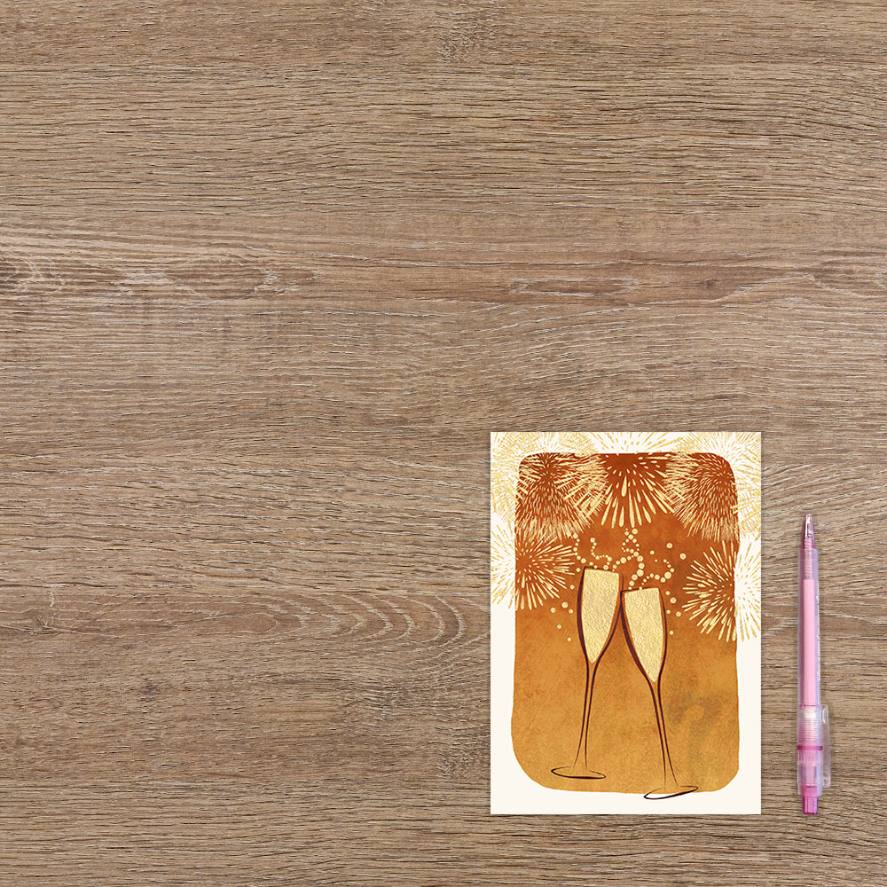 De wenskaart heeft een afmeting van x en een staande vorm. Op deze wenskaart staan twee champagneglaze met op de achtergrond gouden vuurwerk. De binnenzijde van de wenskaart is blanco wat voldoende ruimte geeft om een persoonlijke boodschap te schrijven .