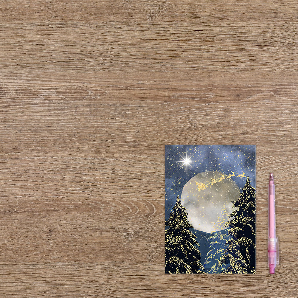 De wenskaart heeft een afmeting van x en een staande vorm. Op deze kerstkaart staat een bos in de nacht met een volle maan waar de kerstslee langsheen vliegt. De binnenzijde van de wenskaart is blanco wat voldoende ruimte geeft om een persoonlijke boodschap te schrijven .