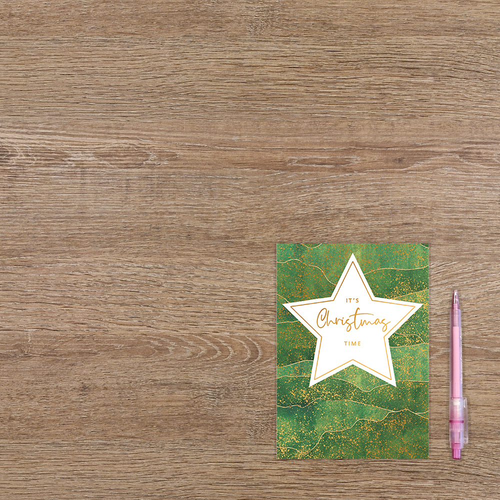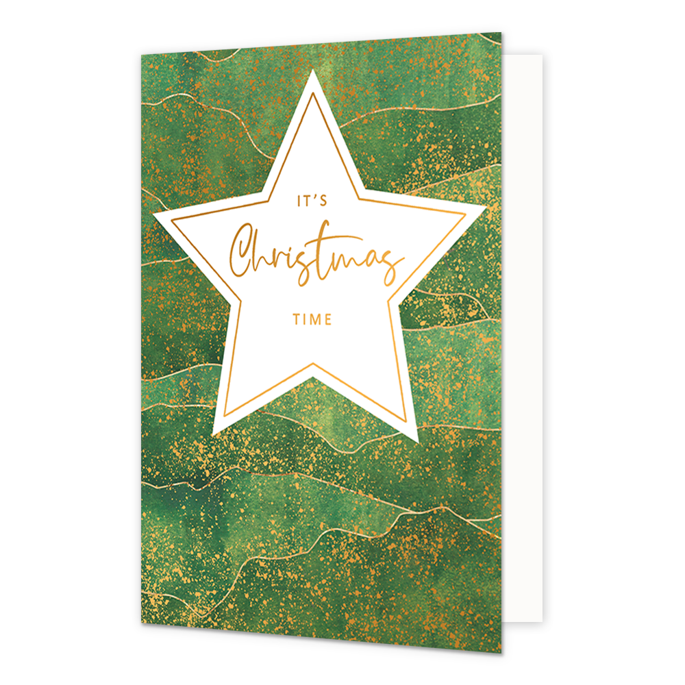 De wenskaart heeft een afmeting van x en een staande vorm. Op deze kerstkaart staat een witte ster op een groene achtergrond met in het midden de tekst: "It's christmas time". De binnenzijde van de wenskaart is blanco wat voldoende ruimte geeft om een persoonlijke boodschap te schrijven .