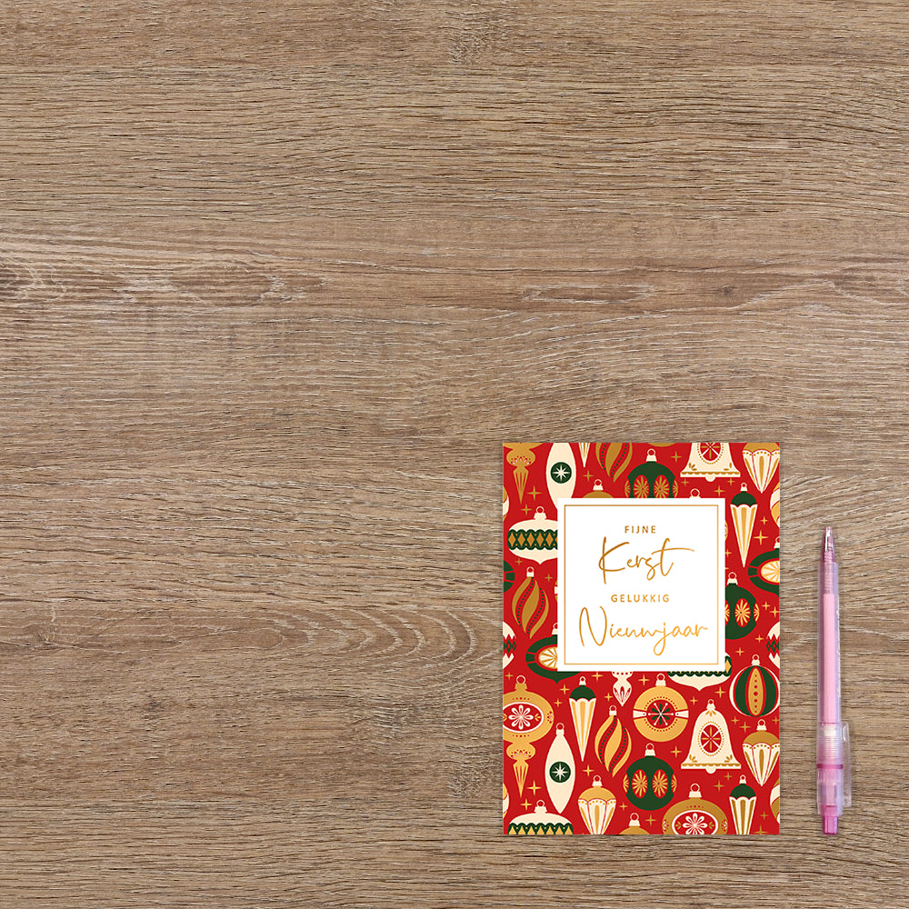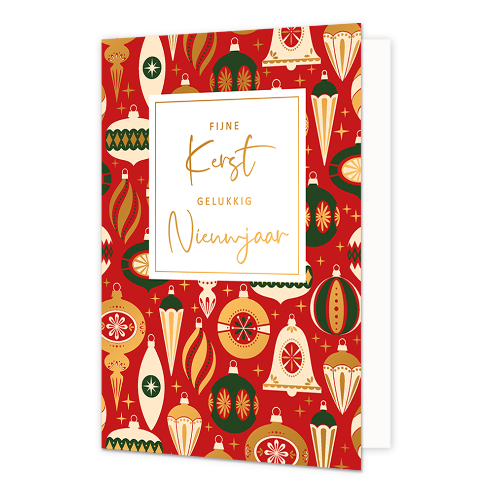 De wenskaart heeft een afmeting van x en een staande vorm. Op deze kerstkaart staan kerstballen in de kleuren goud, wit, groen en rood, met in het midden de tekst: "Fijne kerst gelukkig nieuwjaar". De binnenzijde van de wenskaart is blanco wat voldoende ruimte geeft om een persoonlijke boodschap te schrijven .