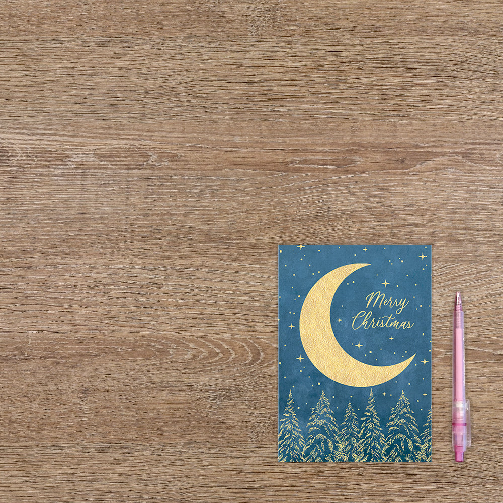 De wenskaart heeft een afmeting van x en een staande vorm. Op deze kerstkaart staat een halve gouden maan boven de bomen met daarnaast de tekst: "Merry christmas". De binnenzijde van de wenskaart is blanco wat voldoende ruimte geeft om een persoonlijke boodschap te schrijven .