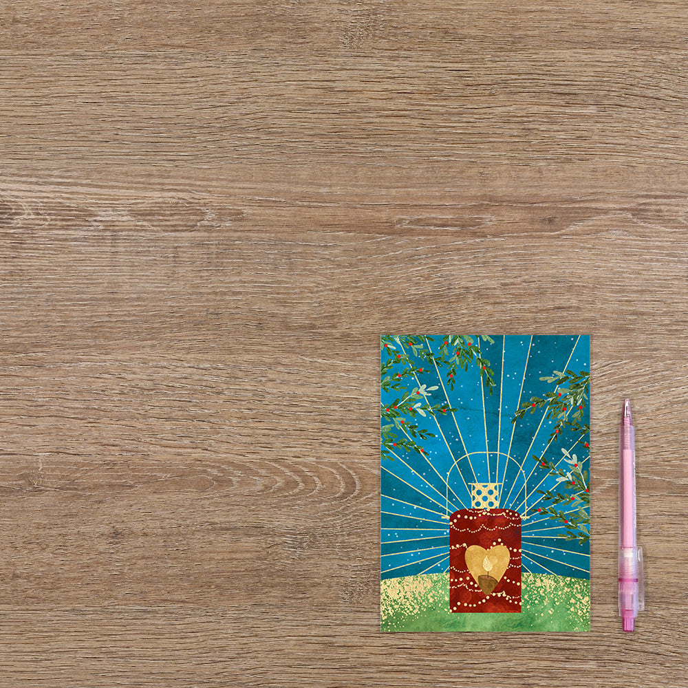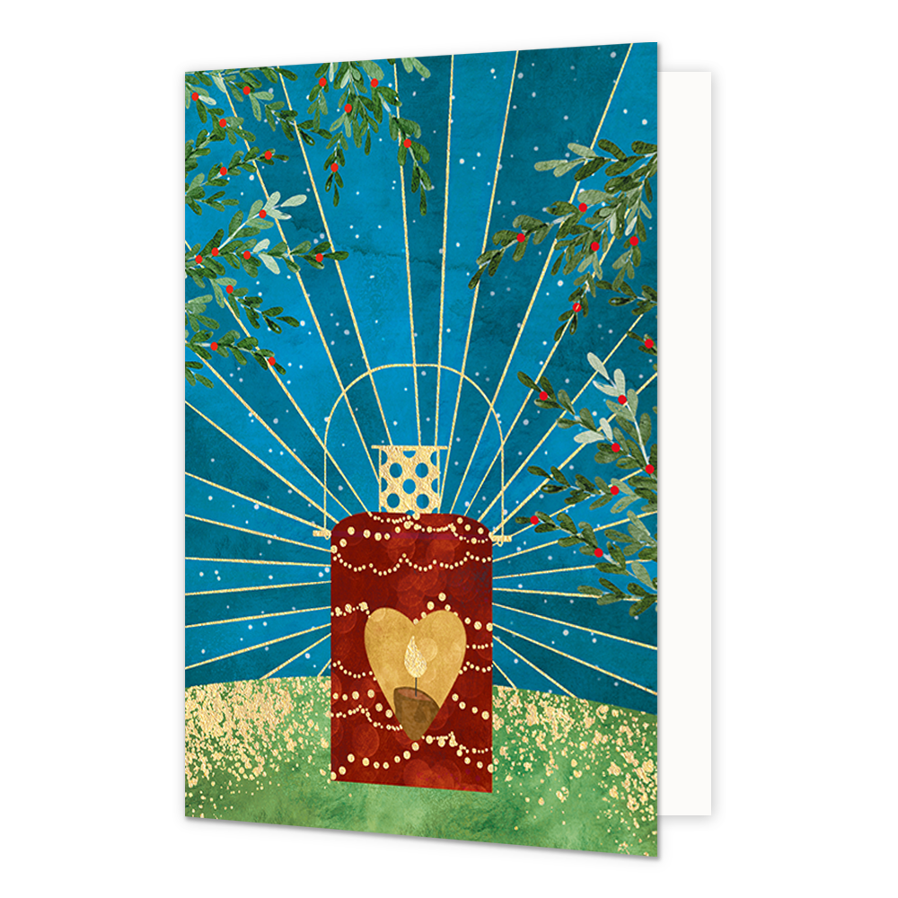 De wenskaart heeft een afmeting van x en een staande vorm. Op deze kerstkaart staat een rode lantaarn met een brandend kaarsje. De binnenzijde van de wenskaart is blanco wat voldoende ruimte geeft om een persoonlijke boodschap te schrijven .