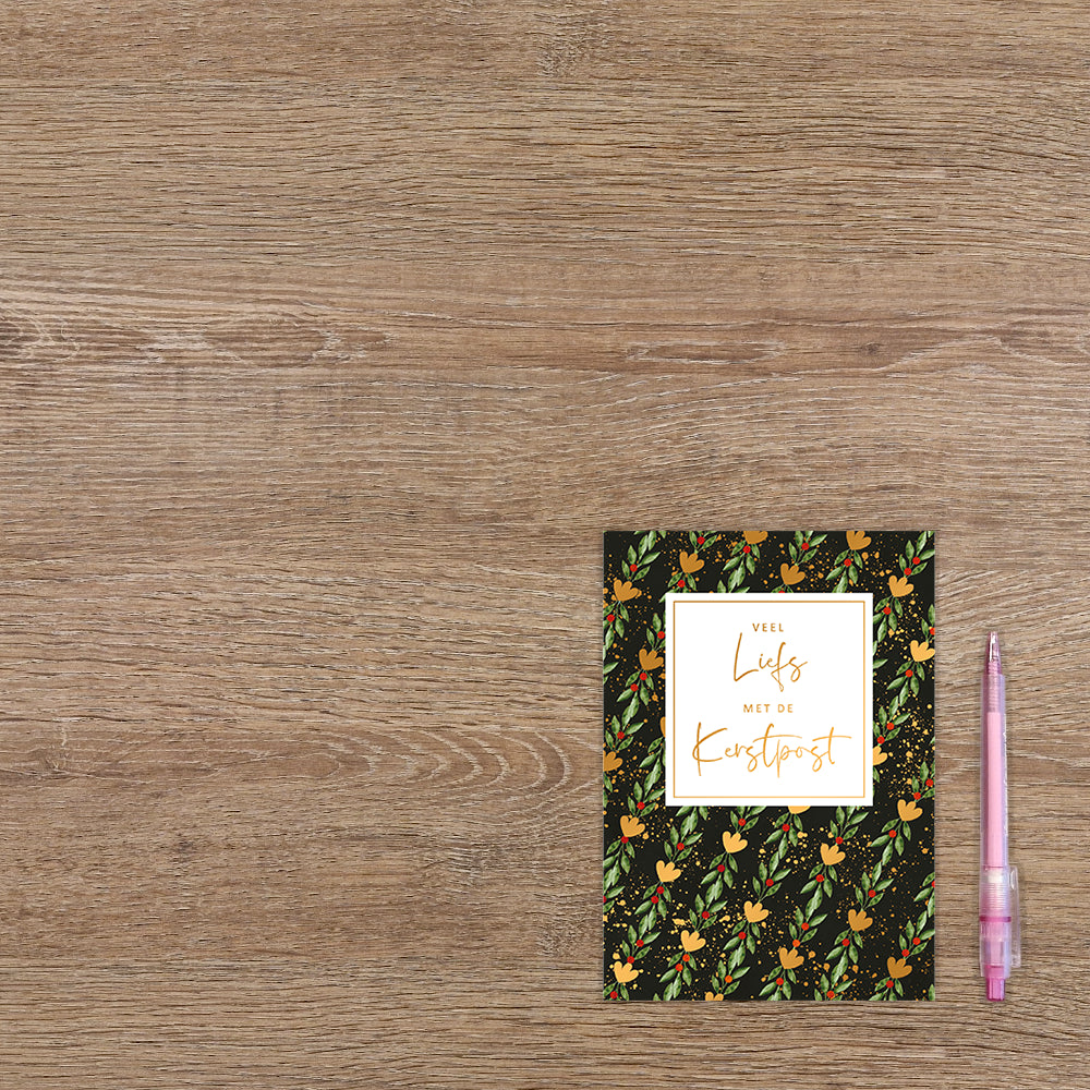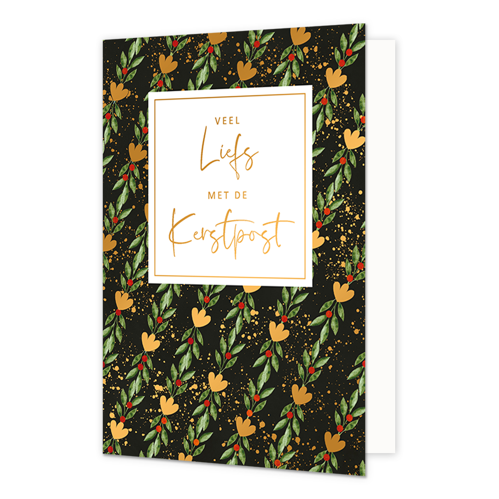 De wenskaart heeft een afmeting van x en een staande vorm. Op deze kerstkaart staan groene en gouden blaadjes met rode besjes en in het midden de tekst: "Veel liefs met de kerstpost". De binnenzijde van de wenskaart is blanco wat voldoende ruimte geeft om een persoonlijke boodschap te schrijven .
