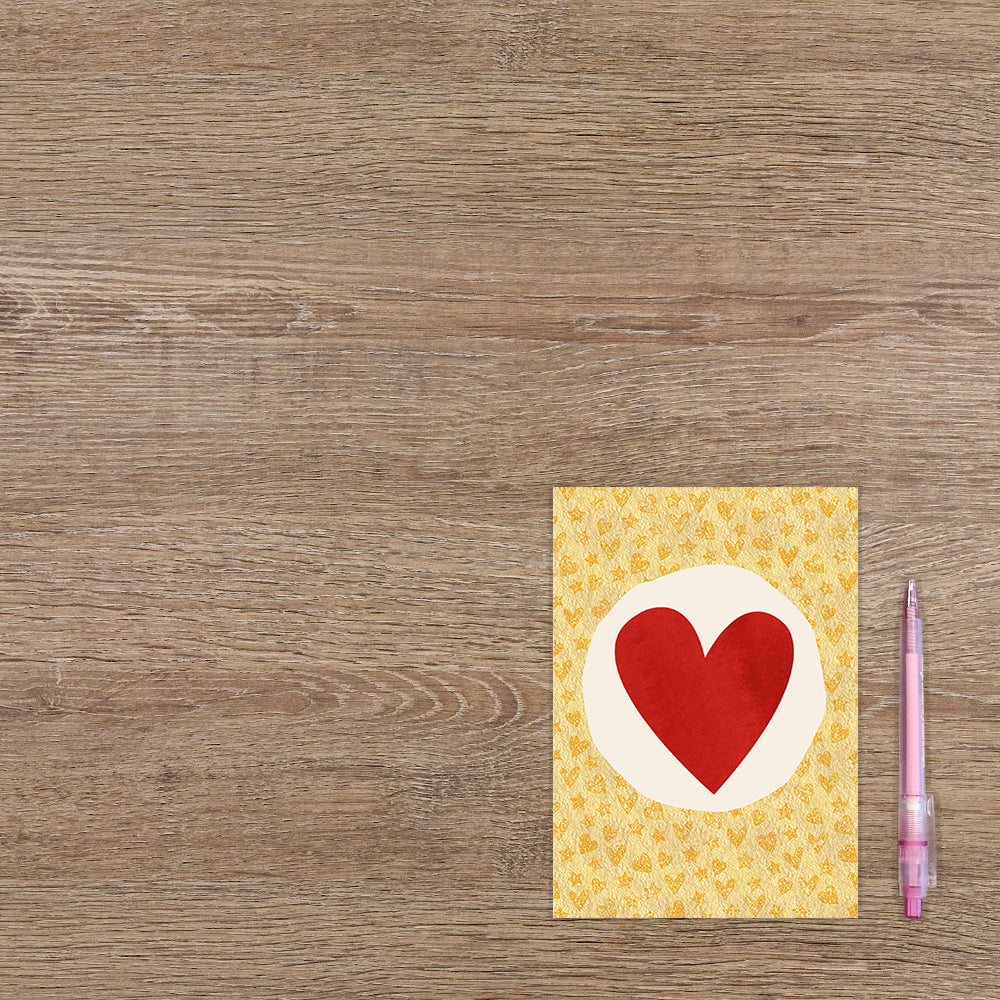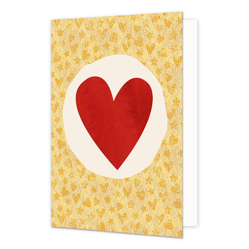 De wenskaart heeft een afmeting van x en een staande vorm. Op deze kerstkaart staat een groot rode hart op een gouden achtergrond. De binnenzijde van de wenskaart is blanco wat voldoende ruimte geeft om een persoonlijke boodschap te schrijven .