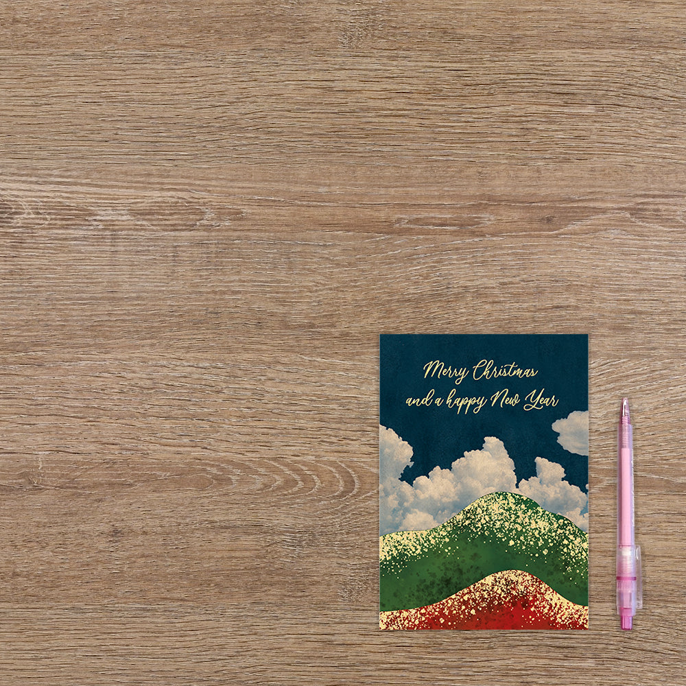 De wenskaart heeft een afmeting van x en een staande vorm. Op deze kerstkaart staan groene en rode heuvels met een blauwe lucht met wolken, met daarin de tekst: "Merry christmas and a happy new year". De binnenzijde van de wenskaart is blanco wat voldoende ruimte geeft om een persoonlijke boodschap te schrijven .