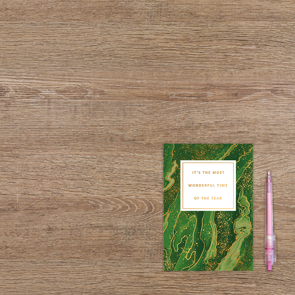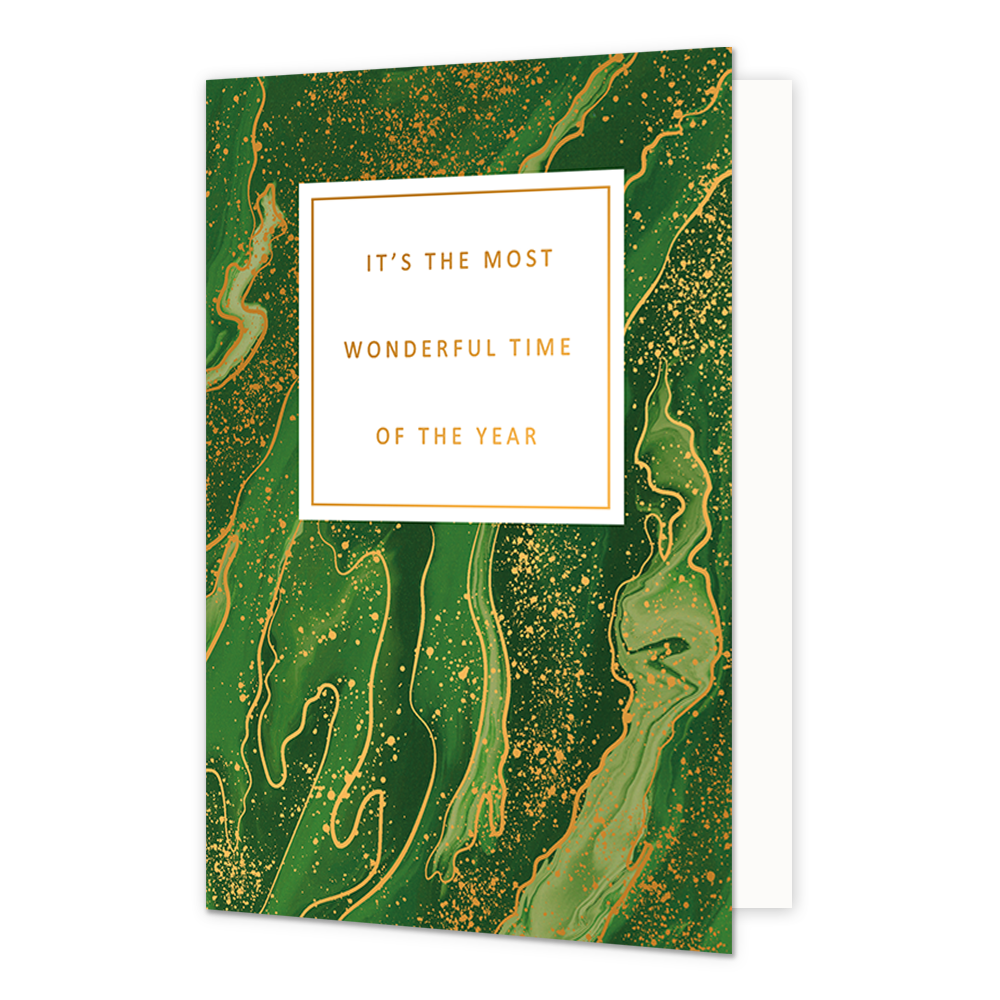 De wenskaart heeft een afmeting van x en een staande vorm. Op deze artistieke kerstkaart staat een ontwerp in de kleuren groen en goud, met in het midden de tekst: "It's the most wonderful time of the year". De binnenzijde van de wenskaart is blanco wat voldoende ruimte geeft om een persoonlijke boodschap te schrijven .